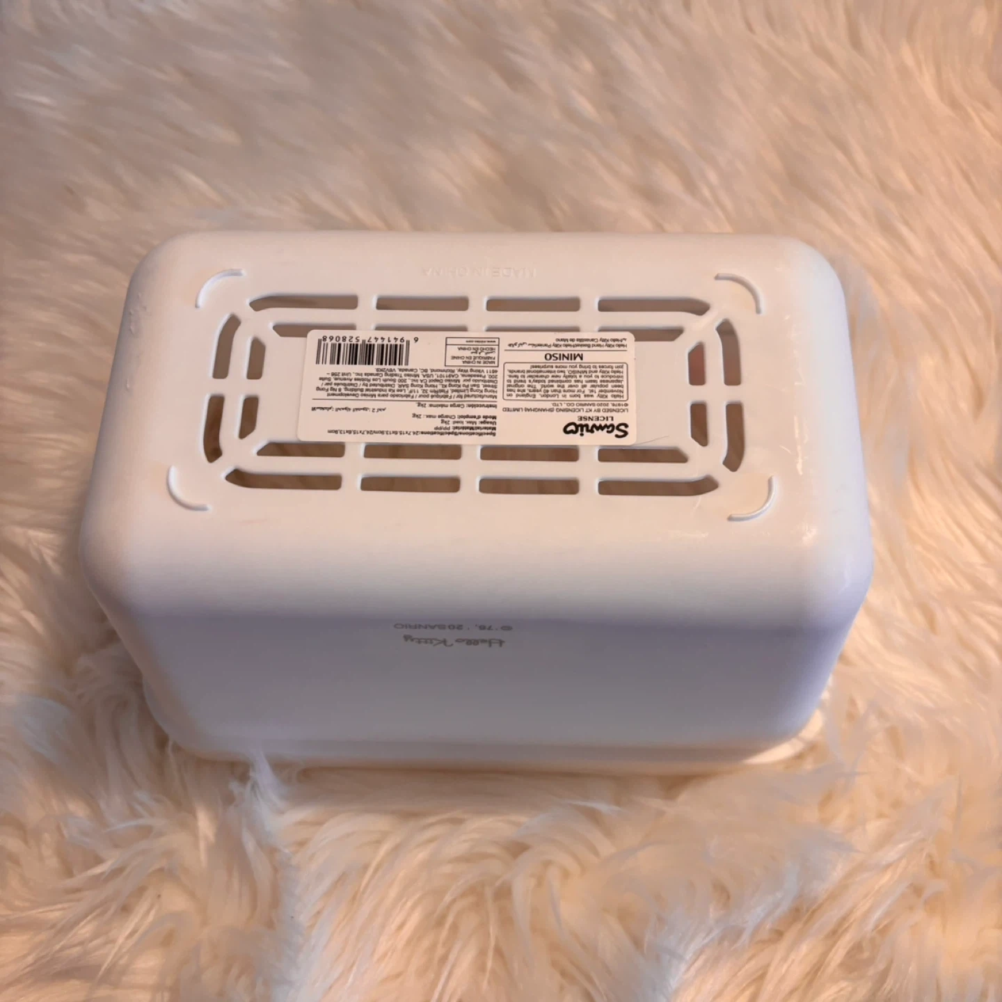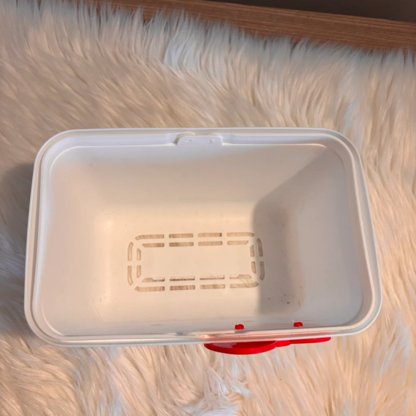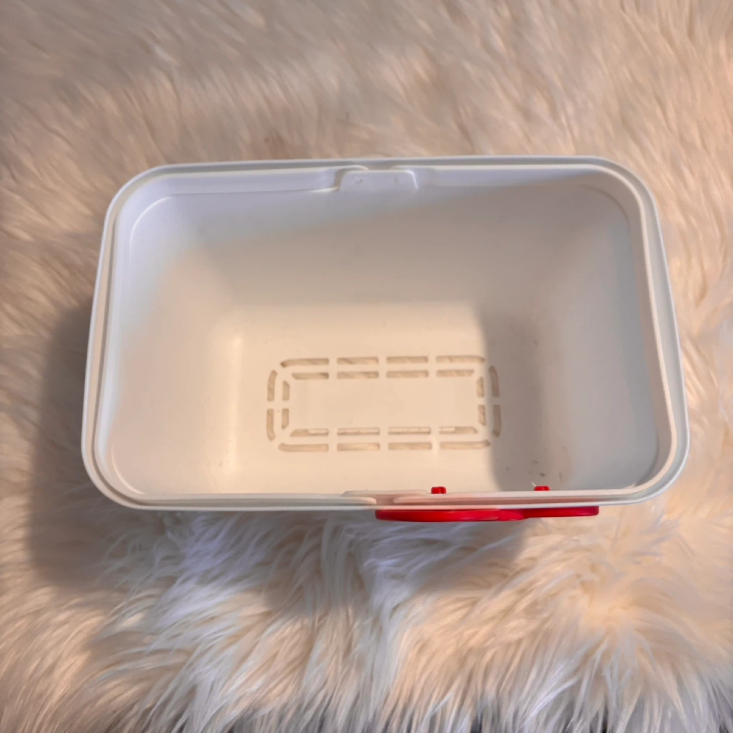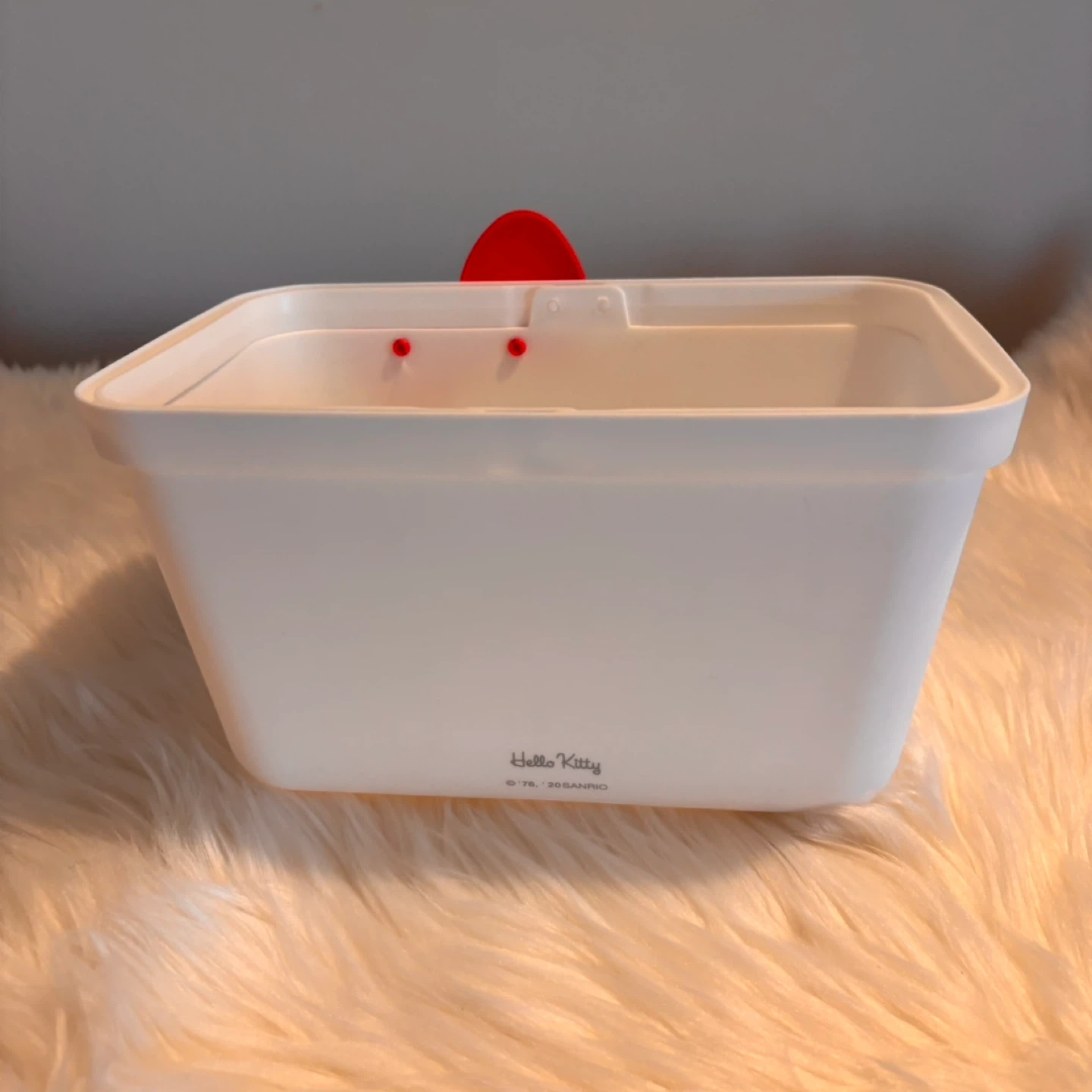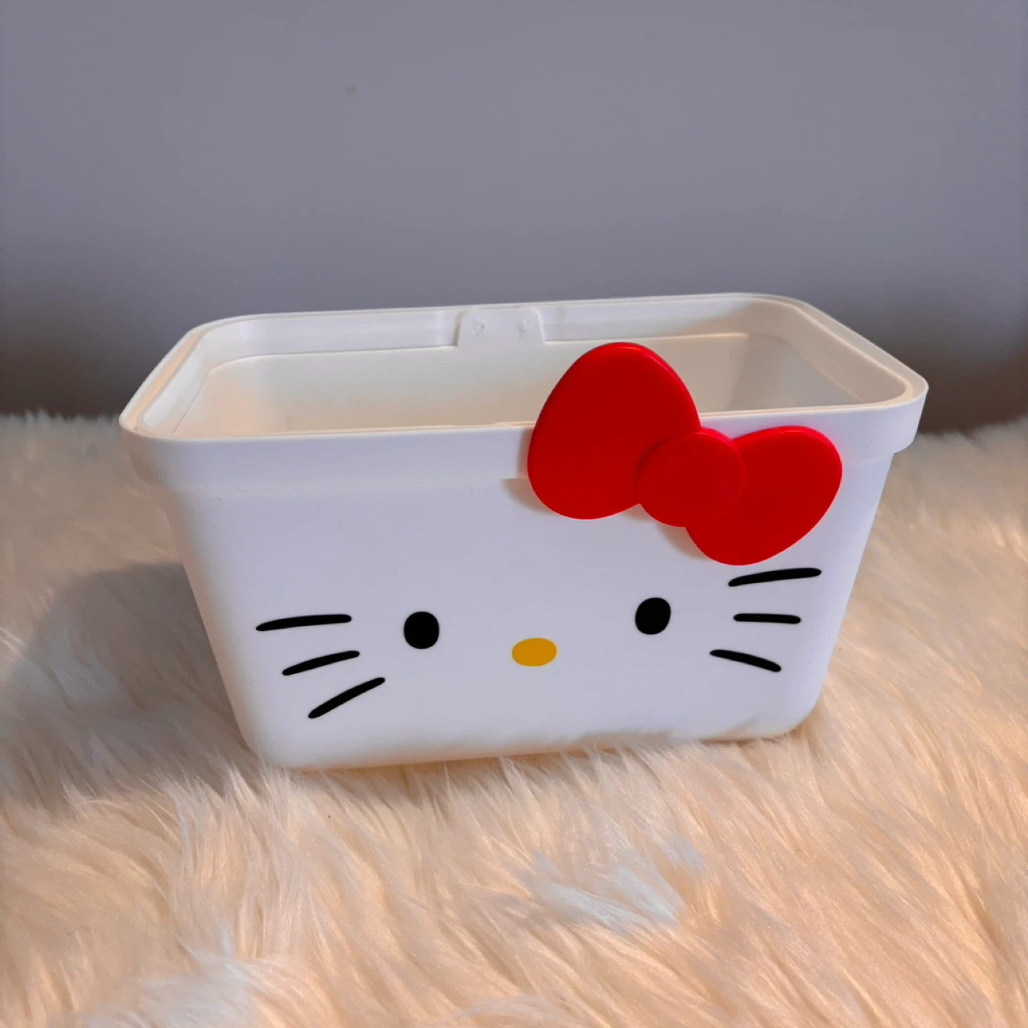 This is a white storage basket featuring the iconic Hello Kitty face with a red bow. It includes a sturdy handle for easy carrying. The basket has a perforated bottom for drainage or ventilation.
