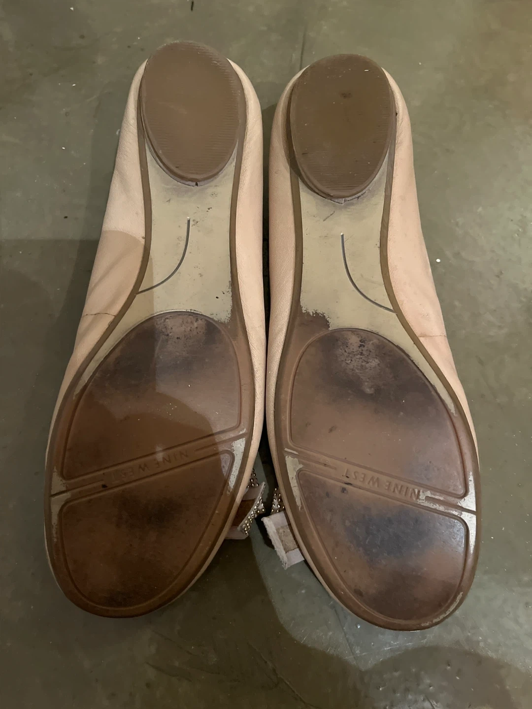 Light beige Nine West ballet flats with a bow accent. Leather upper with a rubber sole. Comfortable for everyday wear. They are a bit narrow for my feet as I have some bunions ðŸ˜