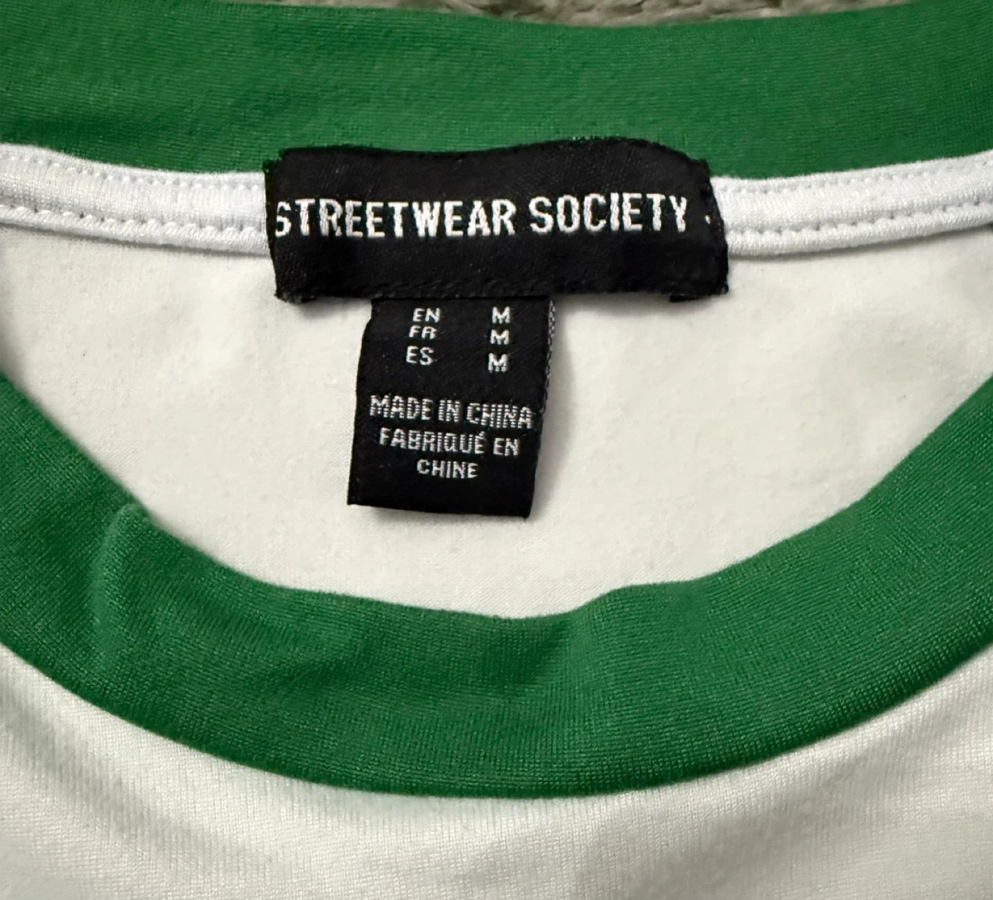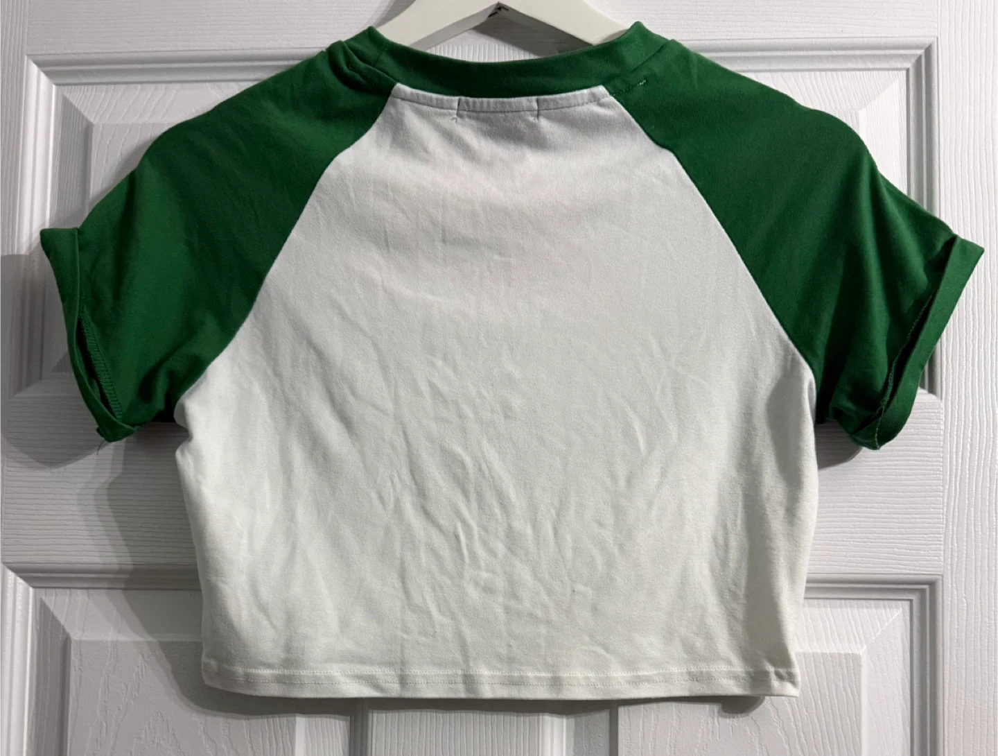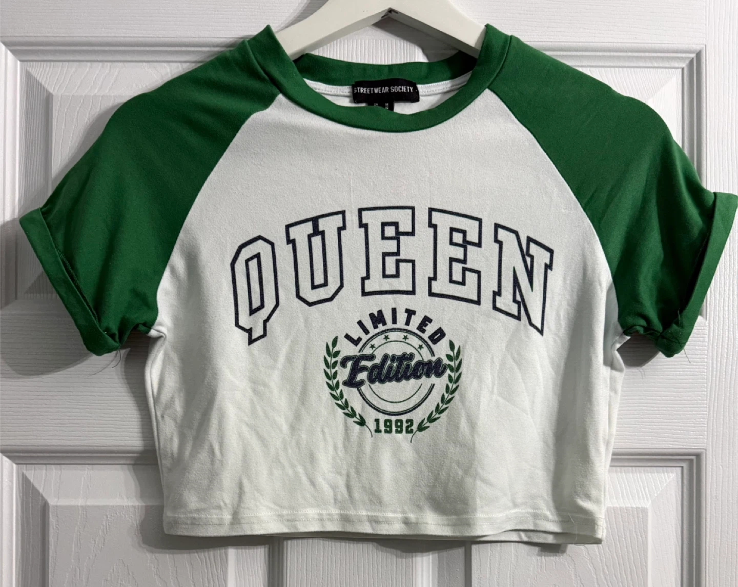 White and green raglan sleeve crop top with "Queen Limited Edition 1992" graphic. Made with 92% polyester and 8% spandex. It's a size medium.