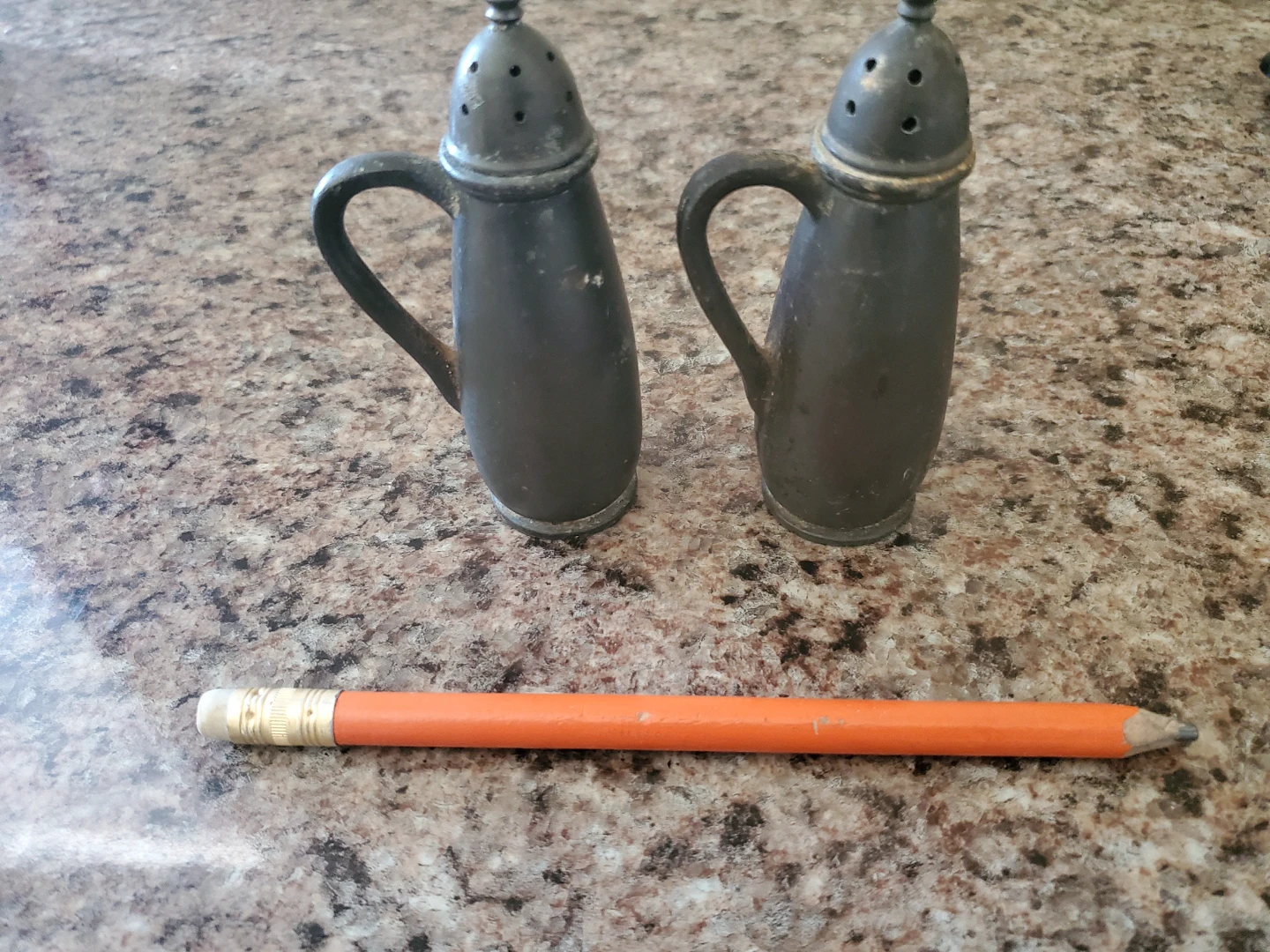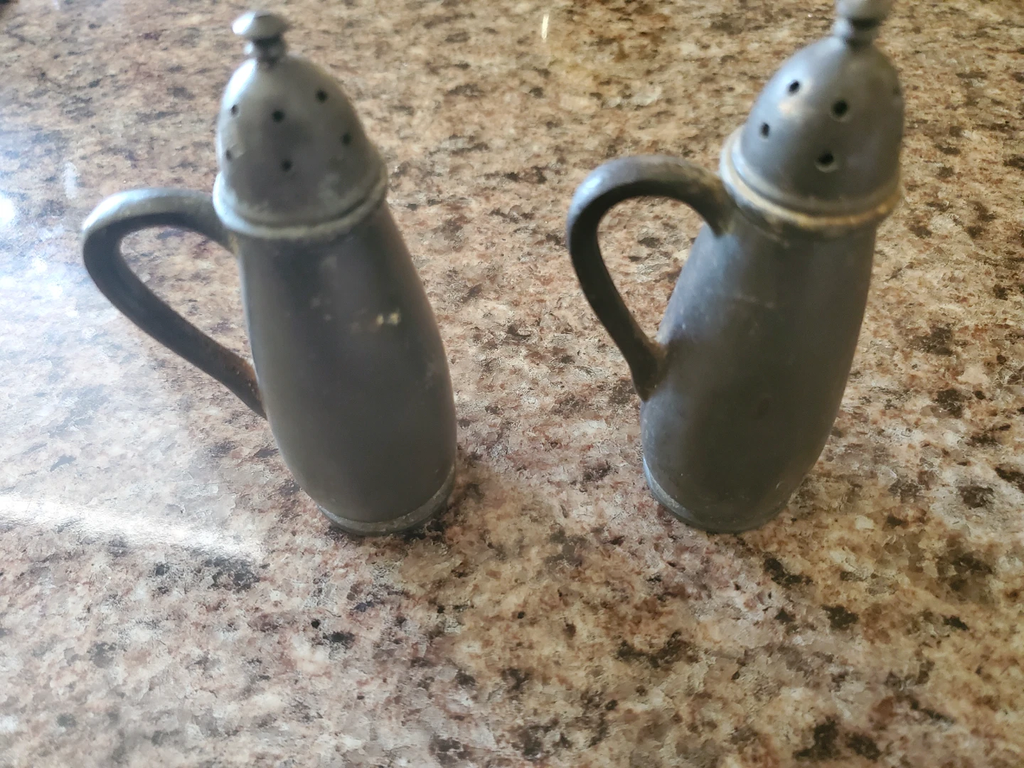 Set of two vintage metal salt and pepper shakers. These shakers have a classic design with handles and perforated tops. Metal construction.