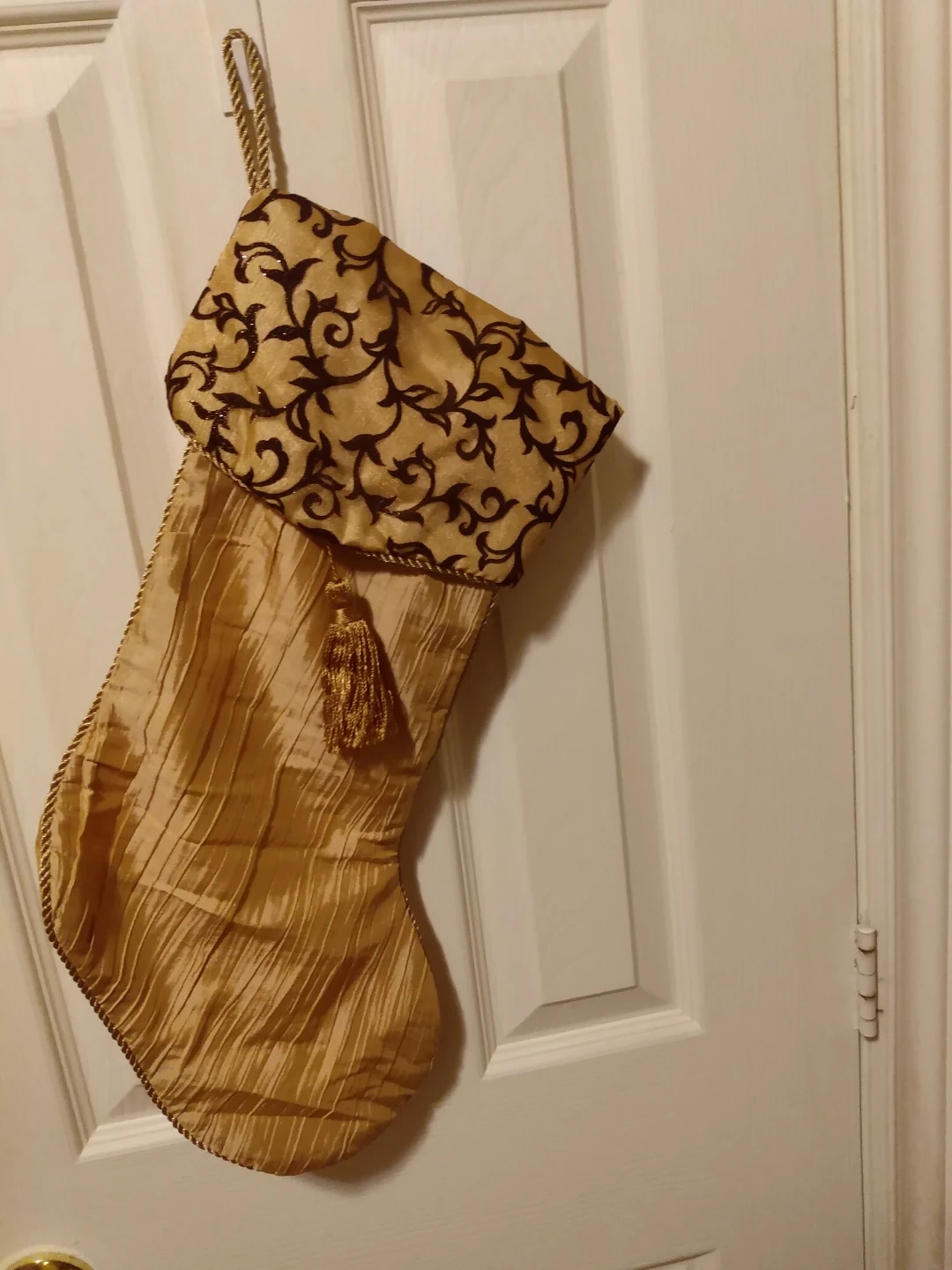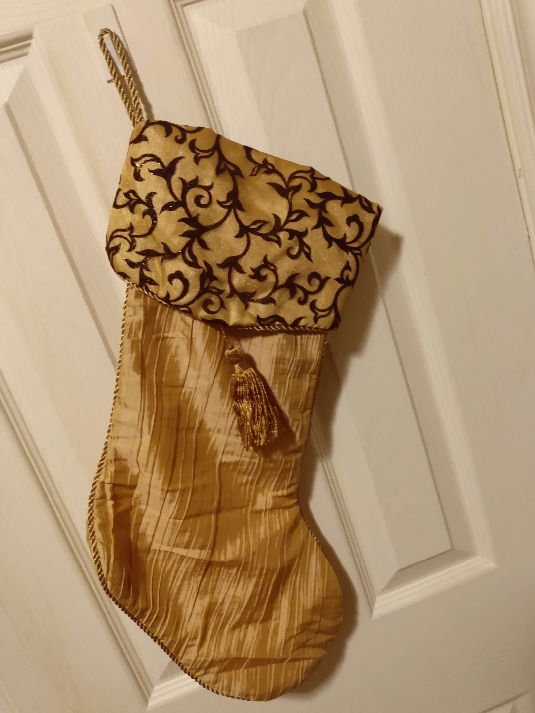 Selling a set of two lovely gold Christmas stocking! It has a decorative brown pattern on the top and a gold tassel. Perfect for adding a touch of elegance to your holiday decor