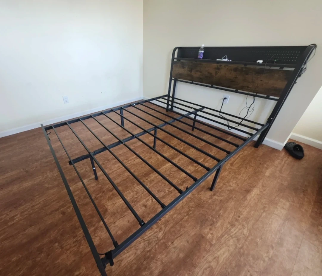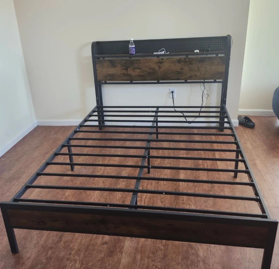 This metal bed frame features a rustic wood-look headboard with built-in shelves and charging ports. It's a sturdy foundation for any mattress. Offers convenient storage and easy access to your electronics.