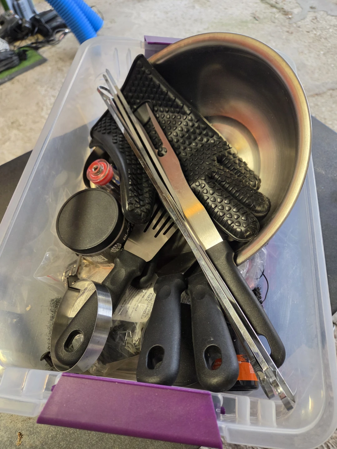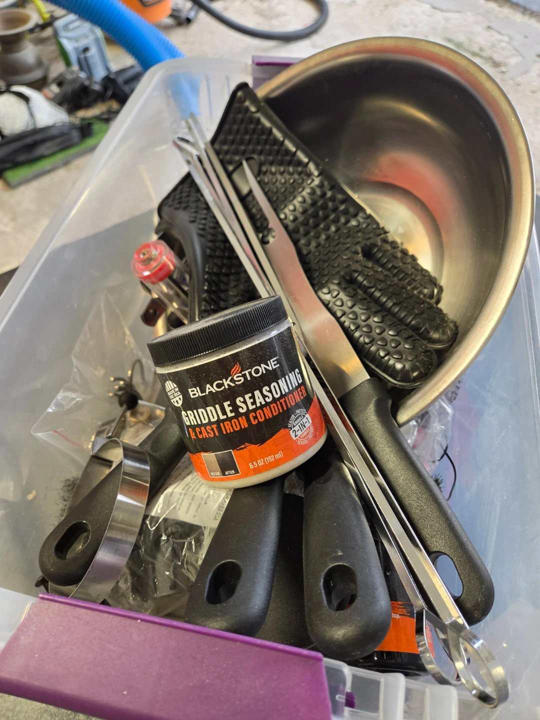 Blackstone Adventure Series griddle. Includes a set of grill utensils and a pair of heat-resistant gloves, along with other balckstone tools.