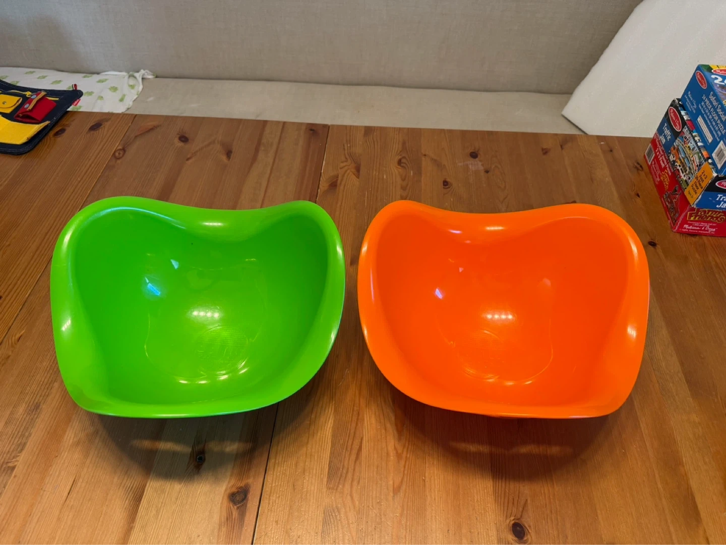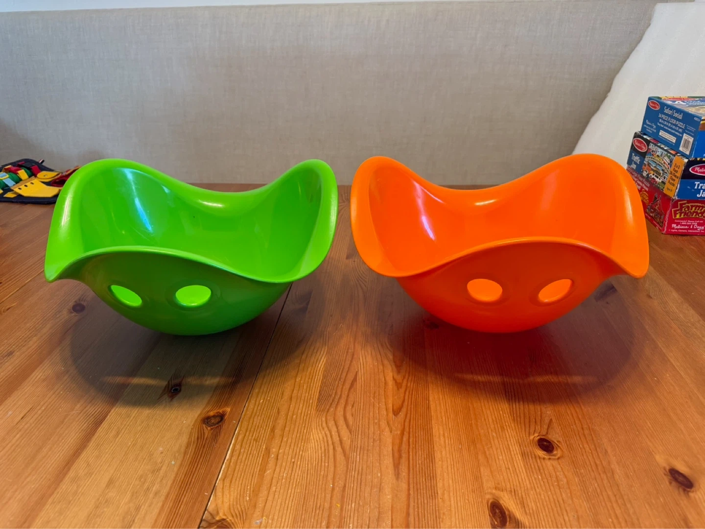 Two Bilibo toys, one green and one orange. These open-ended toys encourage imaginative play and physical activity for kids. They're made of durable plastic.