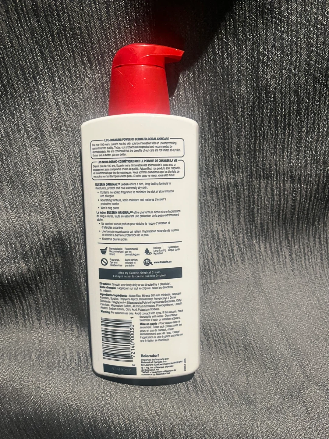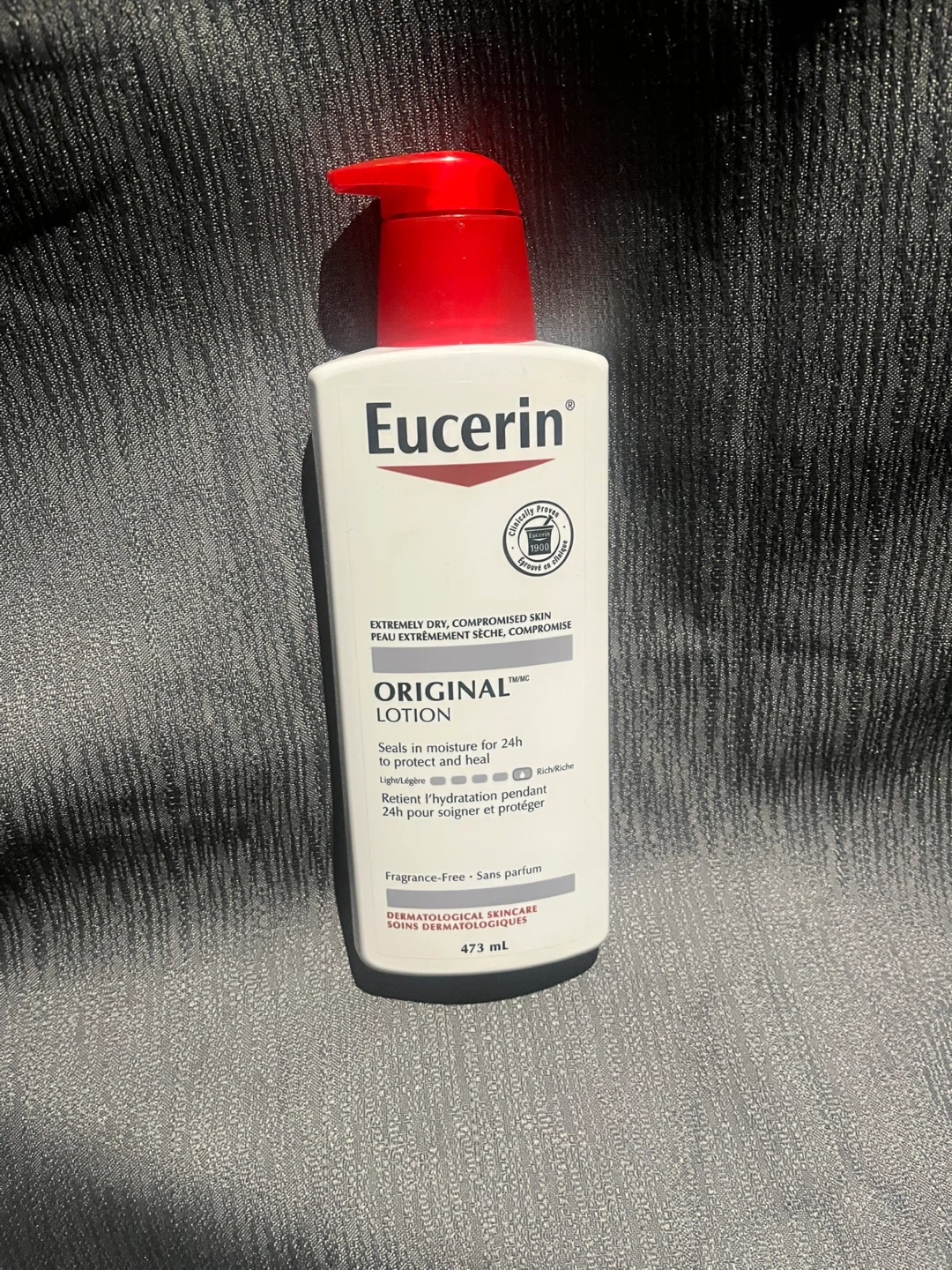 This Eucerin Original Lotion seals in moisture for 24h to protect and heal extremely dry skin. It's fragrance-free and suitable for compromised skin. It comes in a 473 mL bottle.