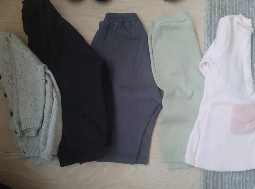 This set includes a gray knit cardigan with button closure. Also comes with a pair of black leggings and gray ribbed pants. A light pink dress with a faux fur pocket is included. These pieces are perfect for a baby girl's wardrobe rotation!