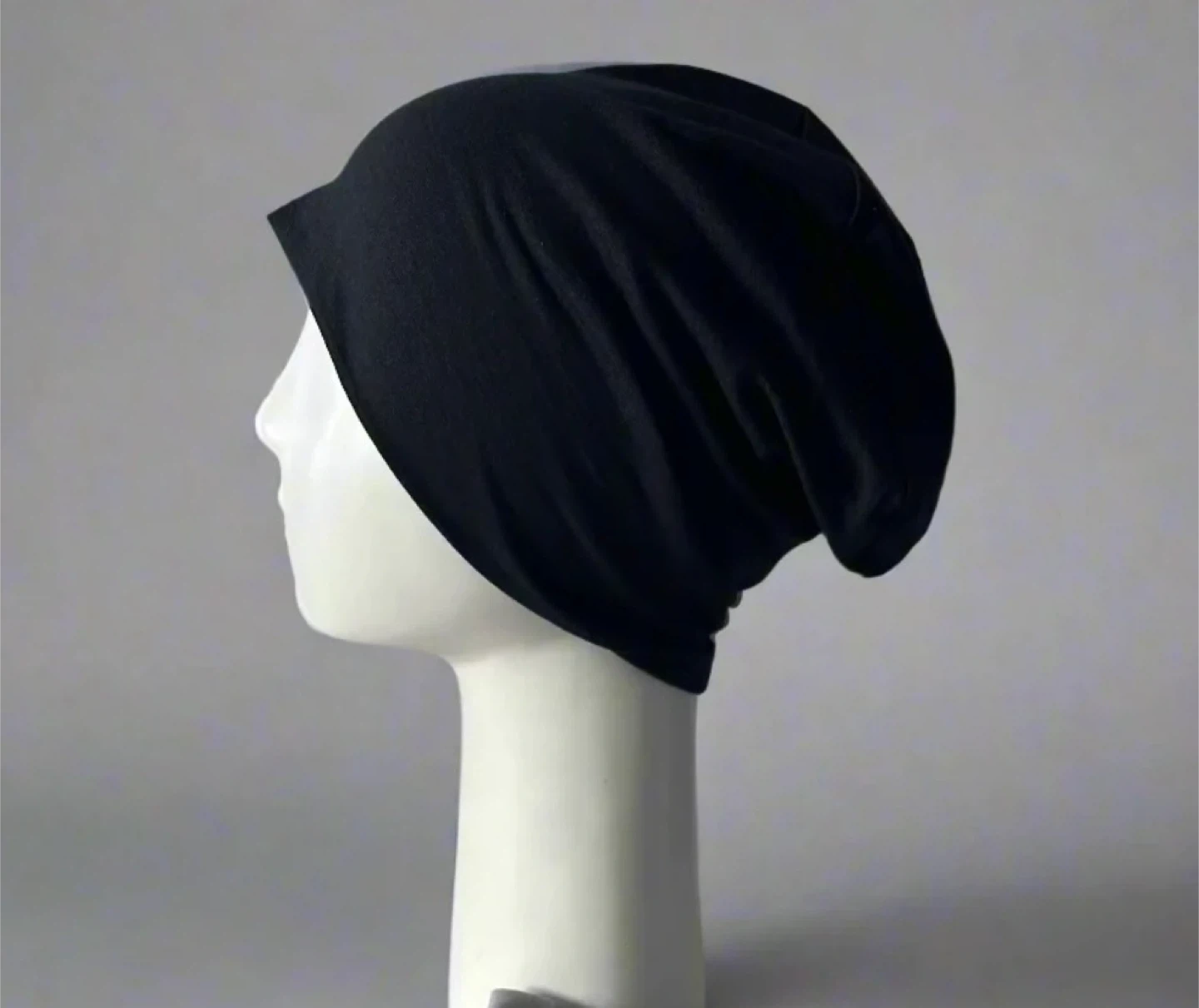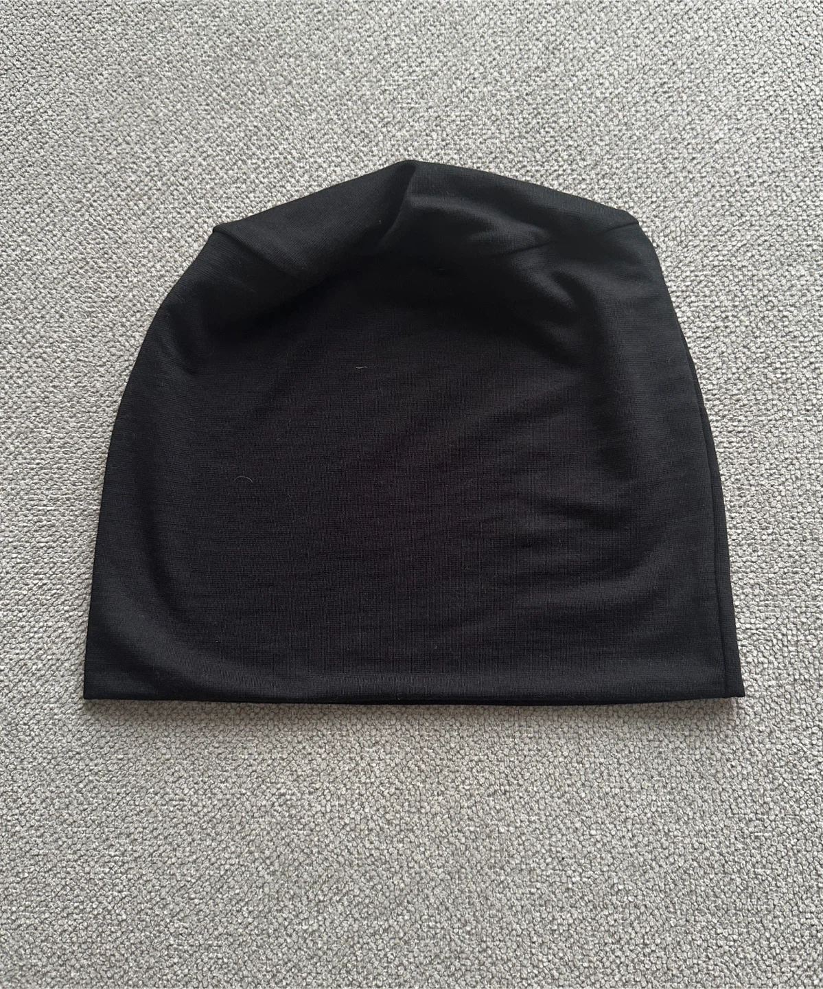This is a soft, black beanie hat. It's made of a comfortable fabric. This hat is good for keeping warm.