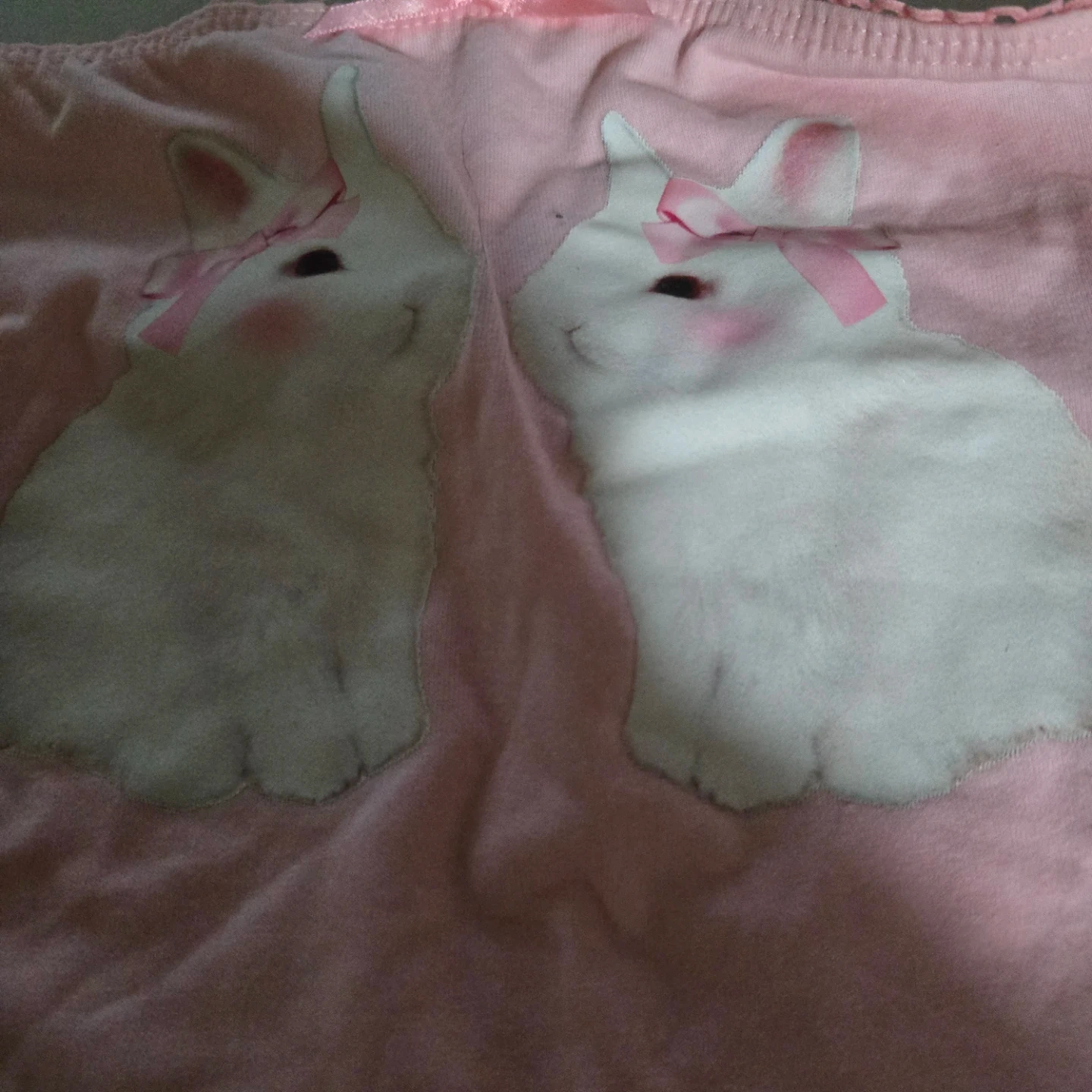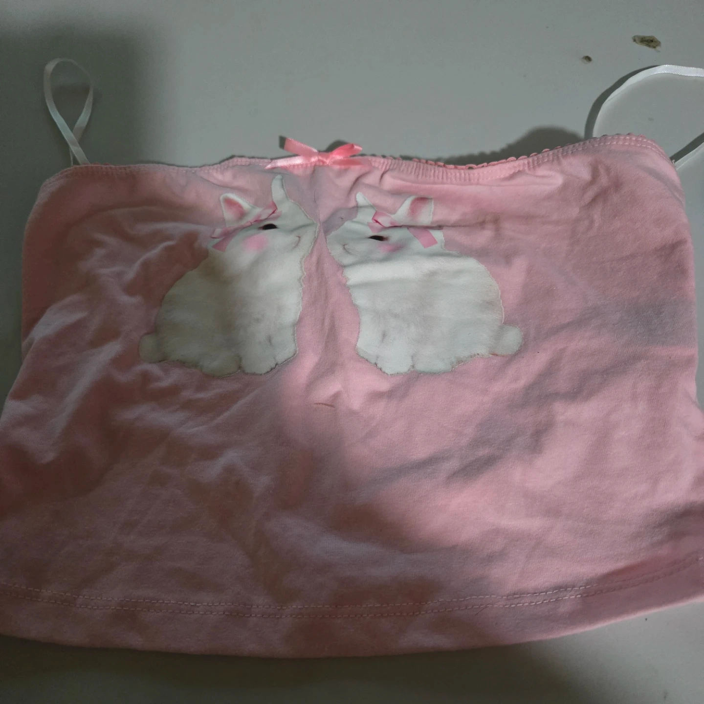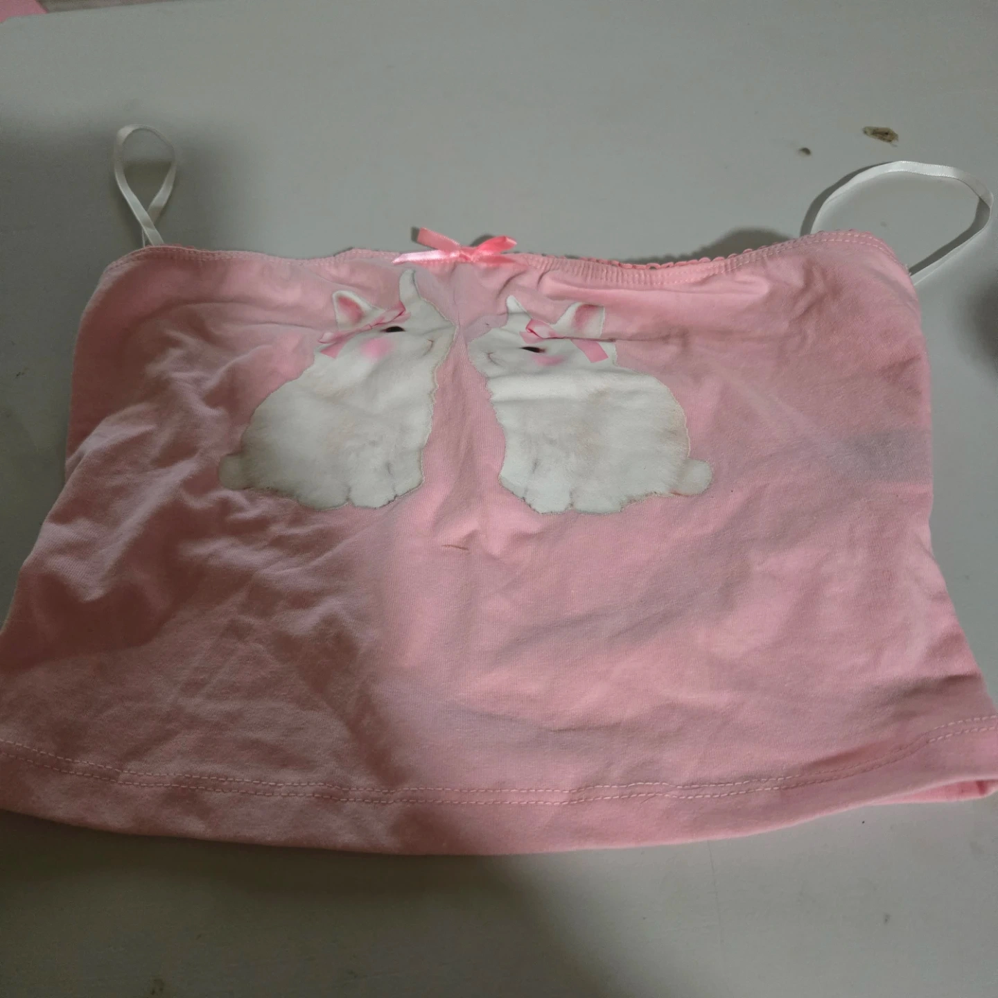 Cute pink camisole top. It features a sweet bunny graphic on the front with a small pink bow. Made of soft fabric for comfort.