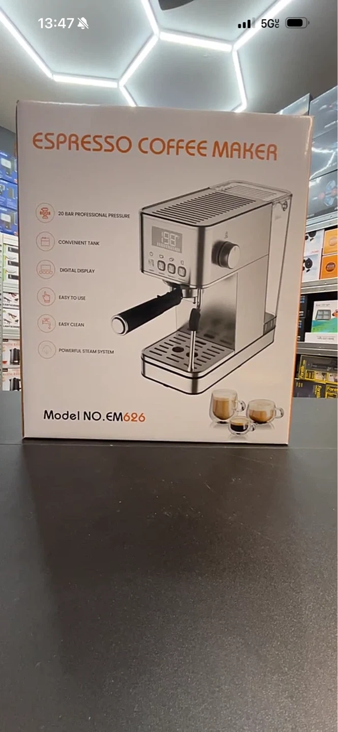 This is an espresso coffee maker with 20 bar professional pressure. It features a convenient tank, digital display, and a powerful steam system. It's easy to use and easy to clean. Perfect for making your favorite coffee drinks at home! Brand new in box . Wellington and Halsted
