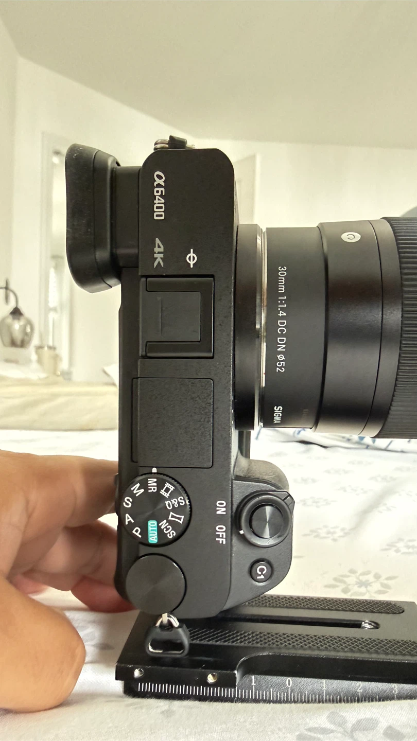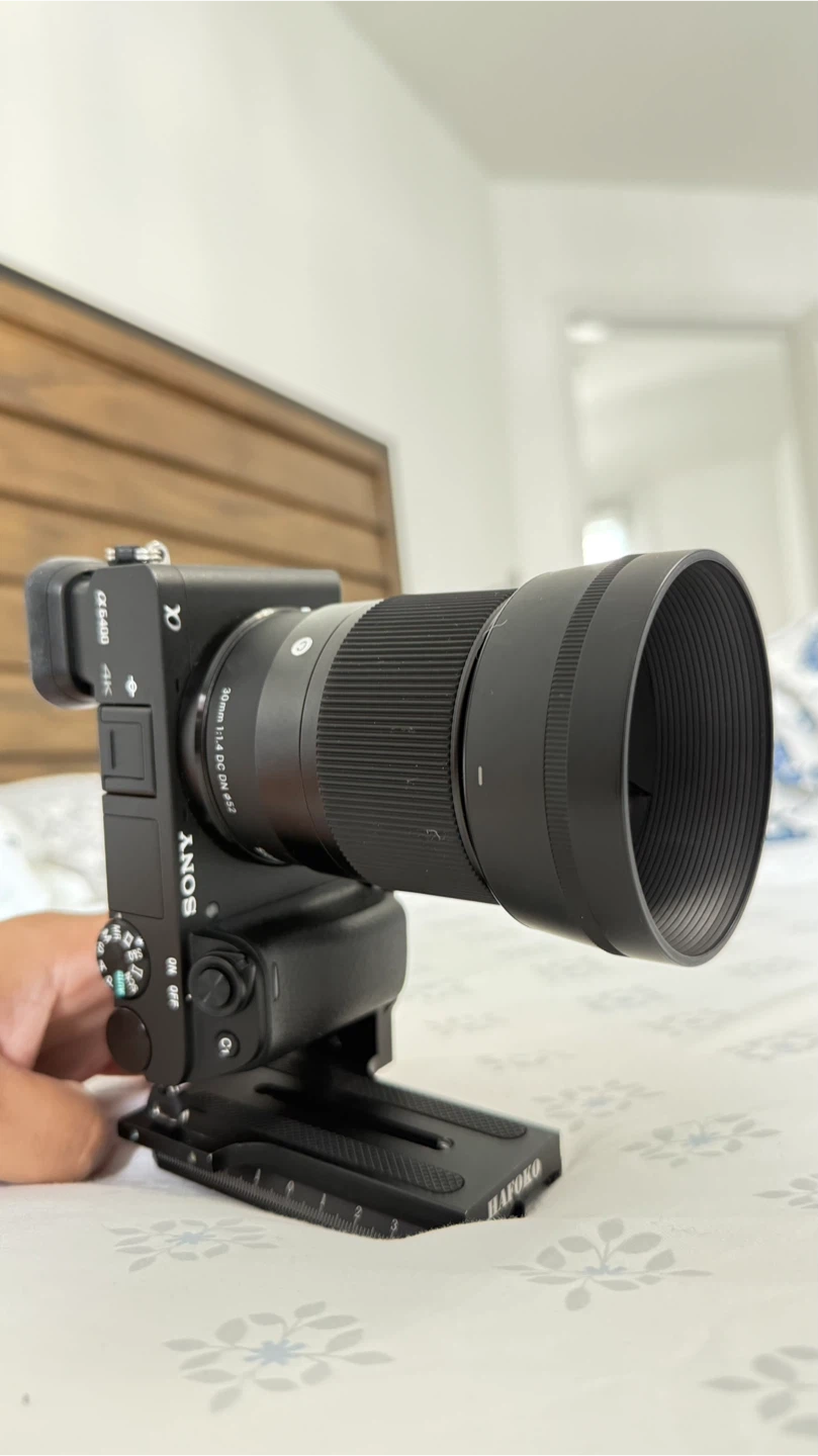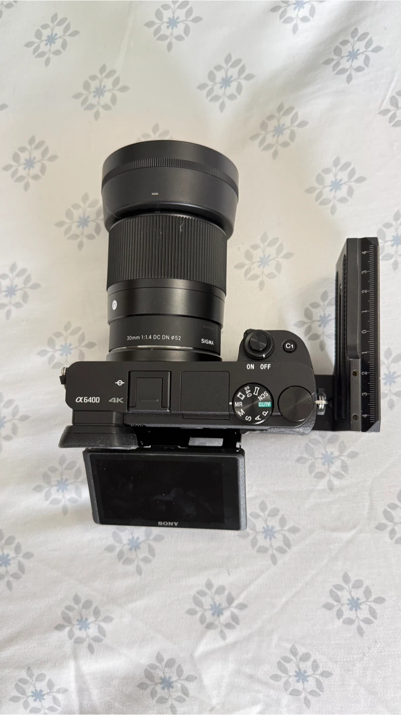 This is a Sony Alpha a6400 mirrorless camera with a Sigma 30mm f/1.4 DC DN lens. It's a 4K camera. The lens has a 52mm filter thread.