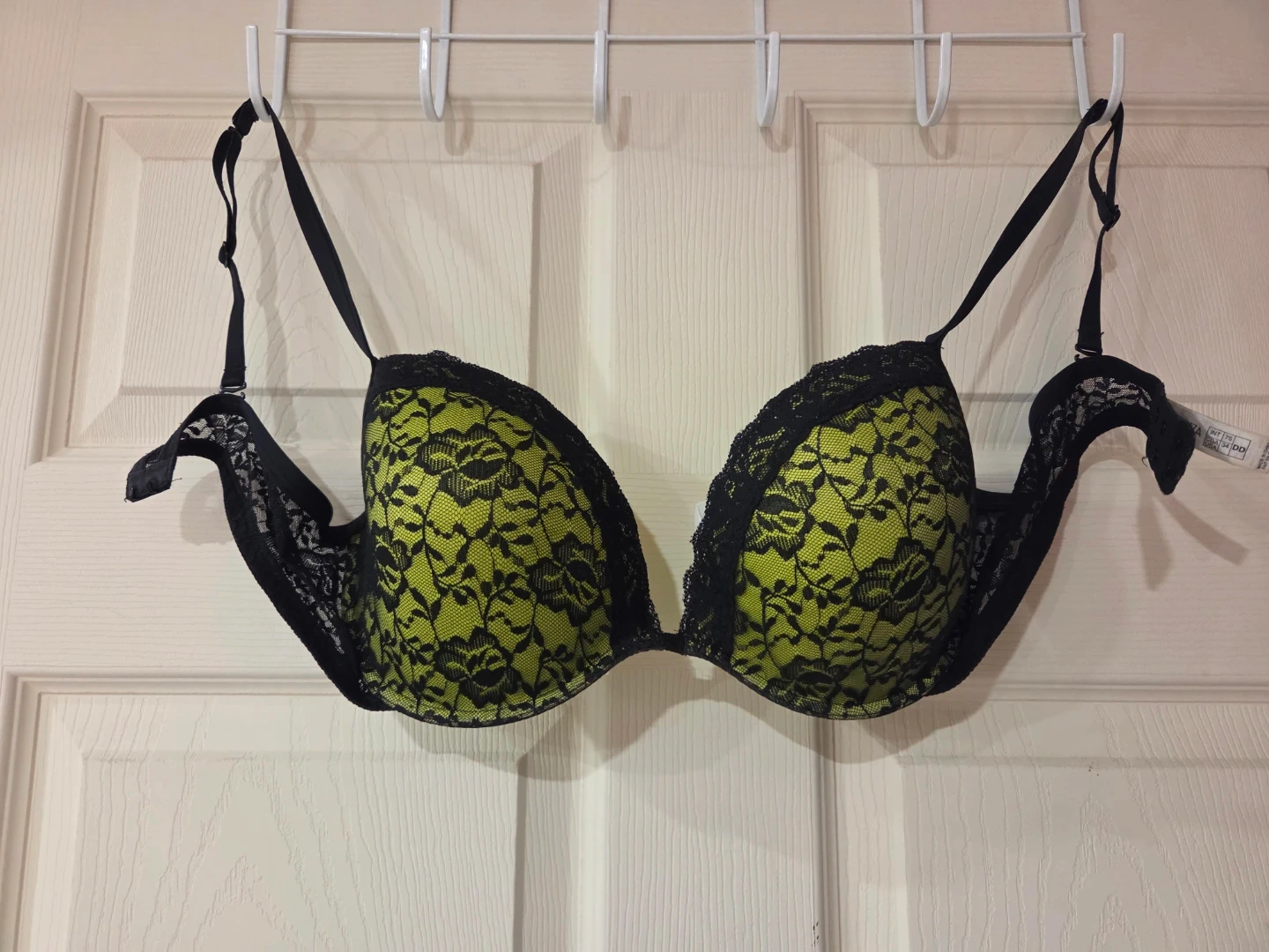 This La Senza bra comes in a bright lime green with black lace detailing. It's a size 34DD. The straps are adjustable for a comfortable fit. Price is firm.