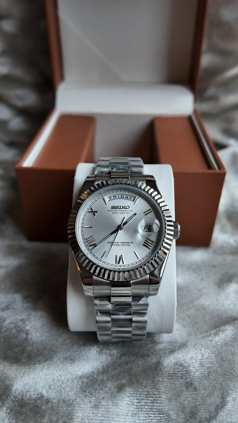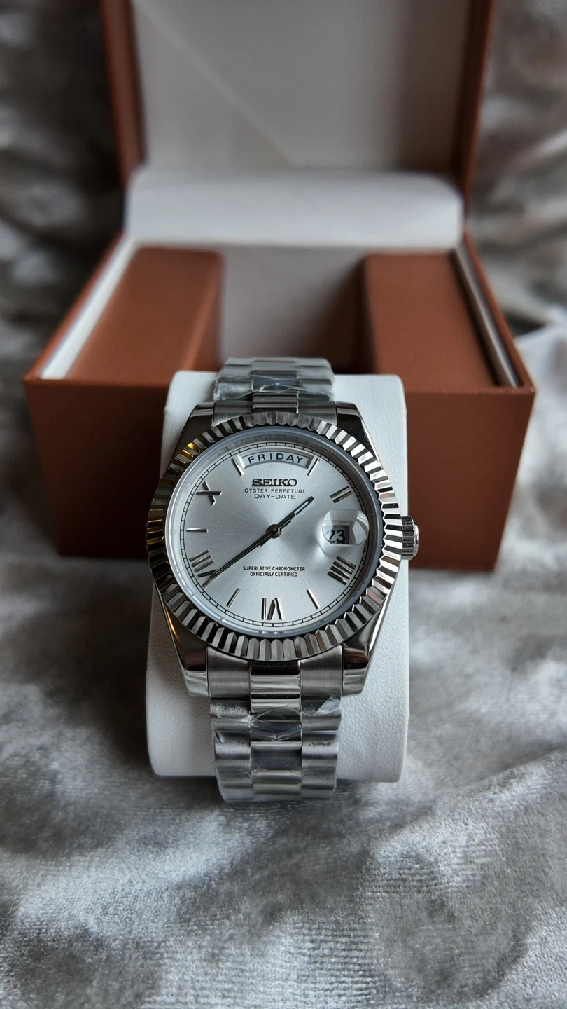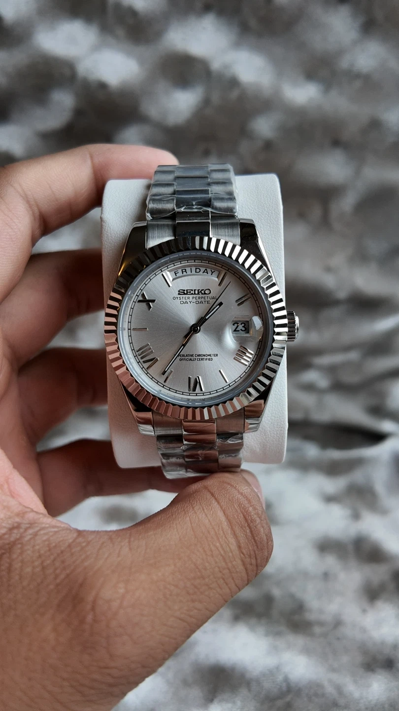 Seiko automatic watch with day and date complication. It features a silver dial with Roman numerals and a stainless steel jubilee bracelet.