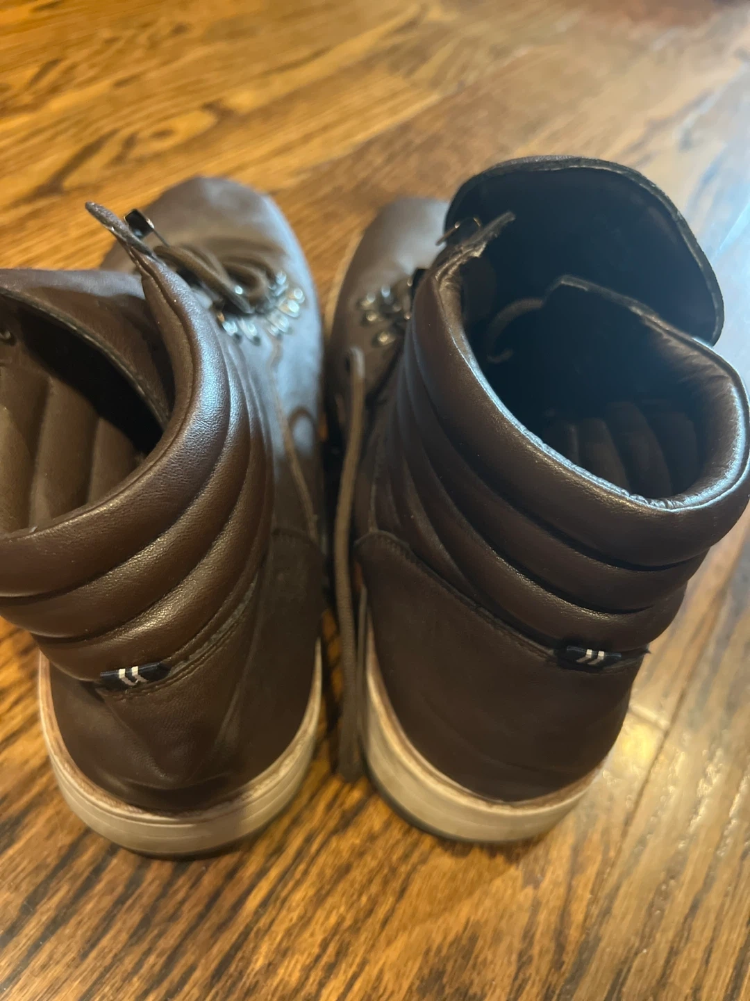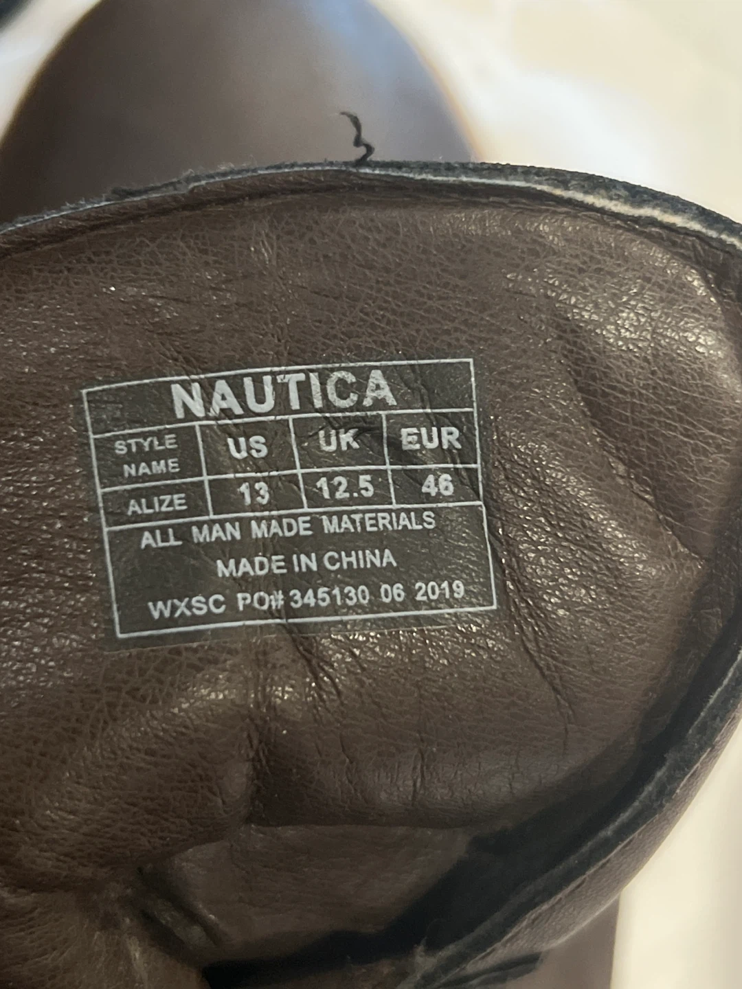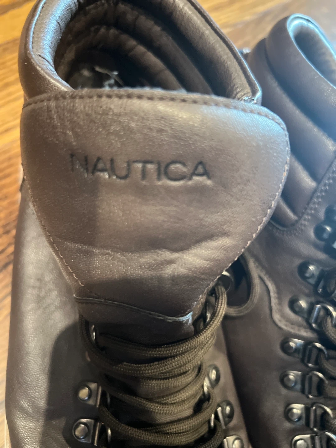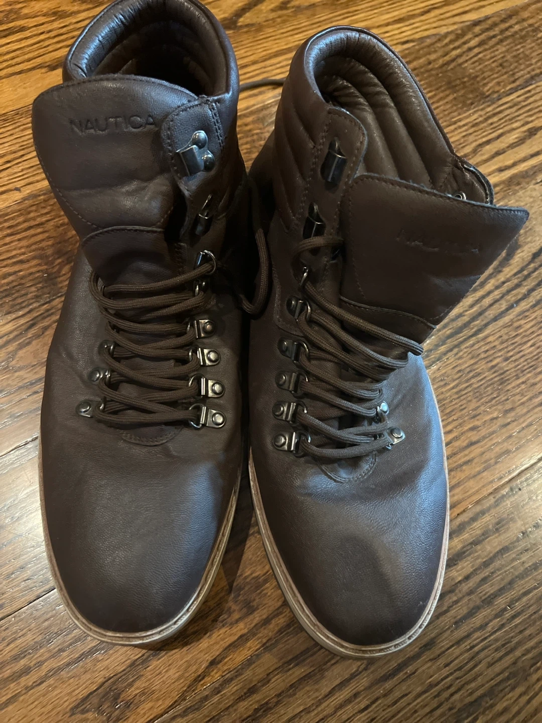 Nautica Alize hiking or dress boots in brown. Men's size US 13, UK 12.5, EUR 46. Made with all man-made materials. These boots feature a durable sole and a classic lace-up design. Perfect for outdoor adventures! Casual