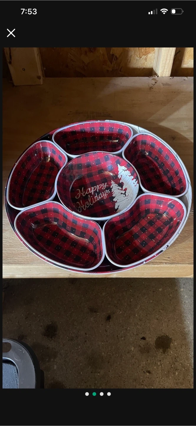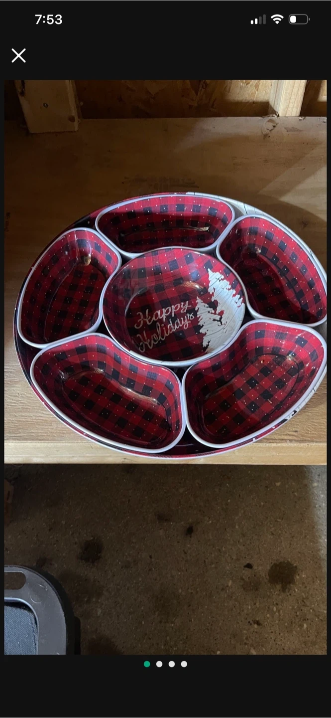 Here's a cute serving tray with a red and black plaid pattern and a "Happy Holidays" message in the center! It has several divided sections, perfect for serving snacks or appetizers during the holidays! It's in good condition and ready for your next gathering