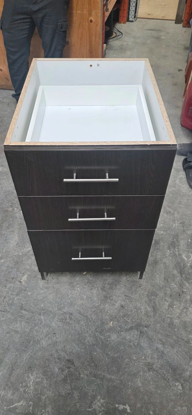 This is a three-drawer cabinet with a dark wood finish and silver handles. It's suitable for general storage. The top section is open. The cabinet is approximately 2 feet tall.