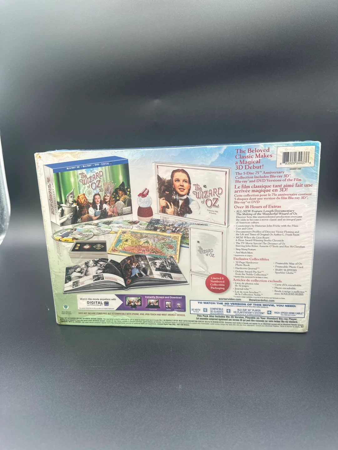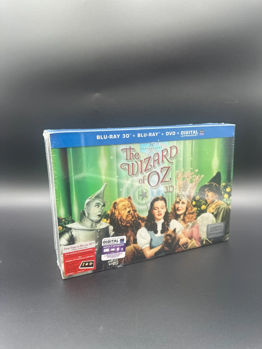 This is the 75th Anniversary Edition of The Wizard of Oz. It's a 5-Disc set including Blu-Ray 3D, Blu-Ray, DVD, and Digital copies. It comes with exclusive collectibles like a photo album and a photo card. The set is still sealed!