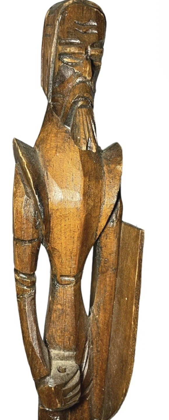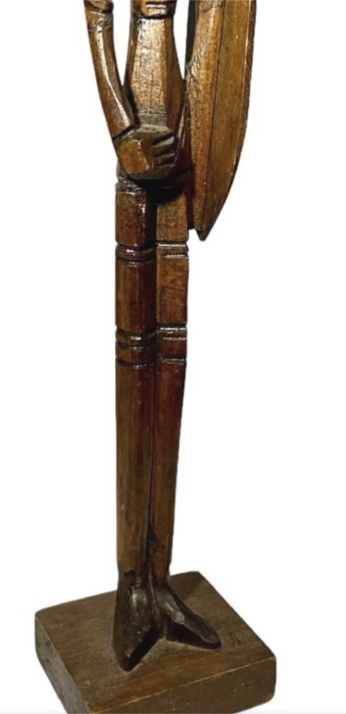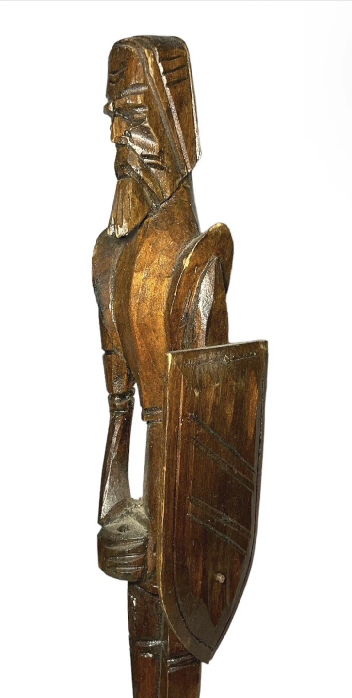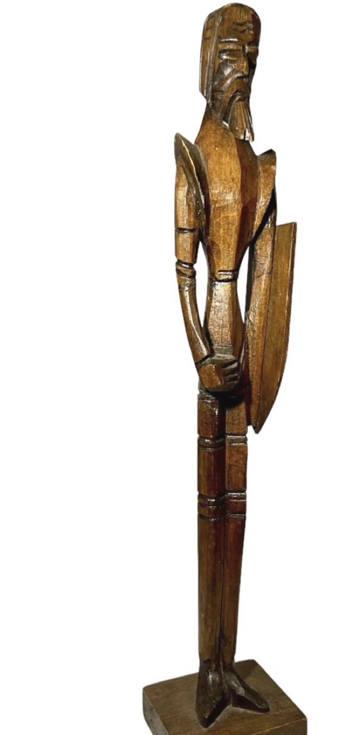 Statue No Staff It's a unique piece with a lot of character, perfect for adding a touch of history to your home decor. The statue features Don Quixote with a shield, showcasing detailed carving work. It stands on a square base and has a rich, dark wood finish