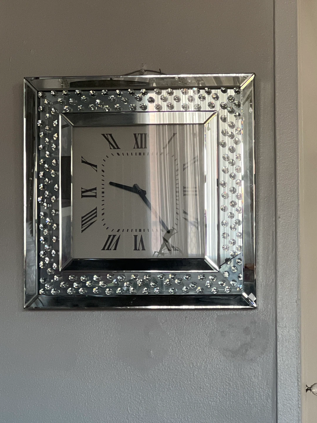 15Selling a square wall clock with a mirrored frame and crystal-like accents! It's a beautiful piece that adds a touch of glam to any room