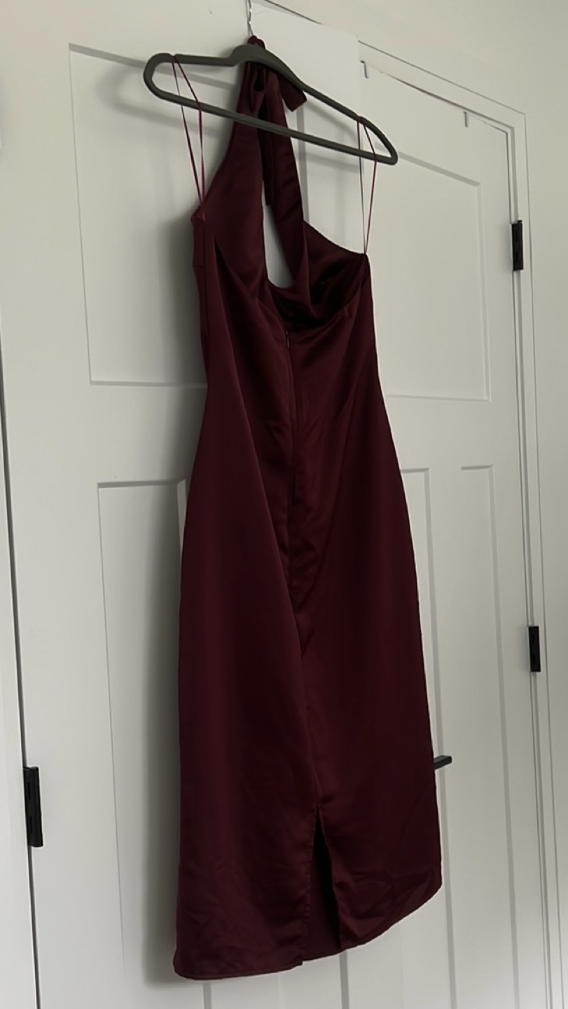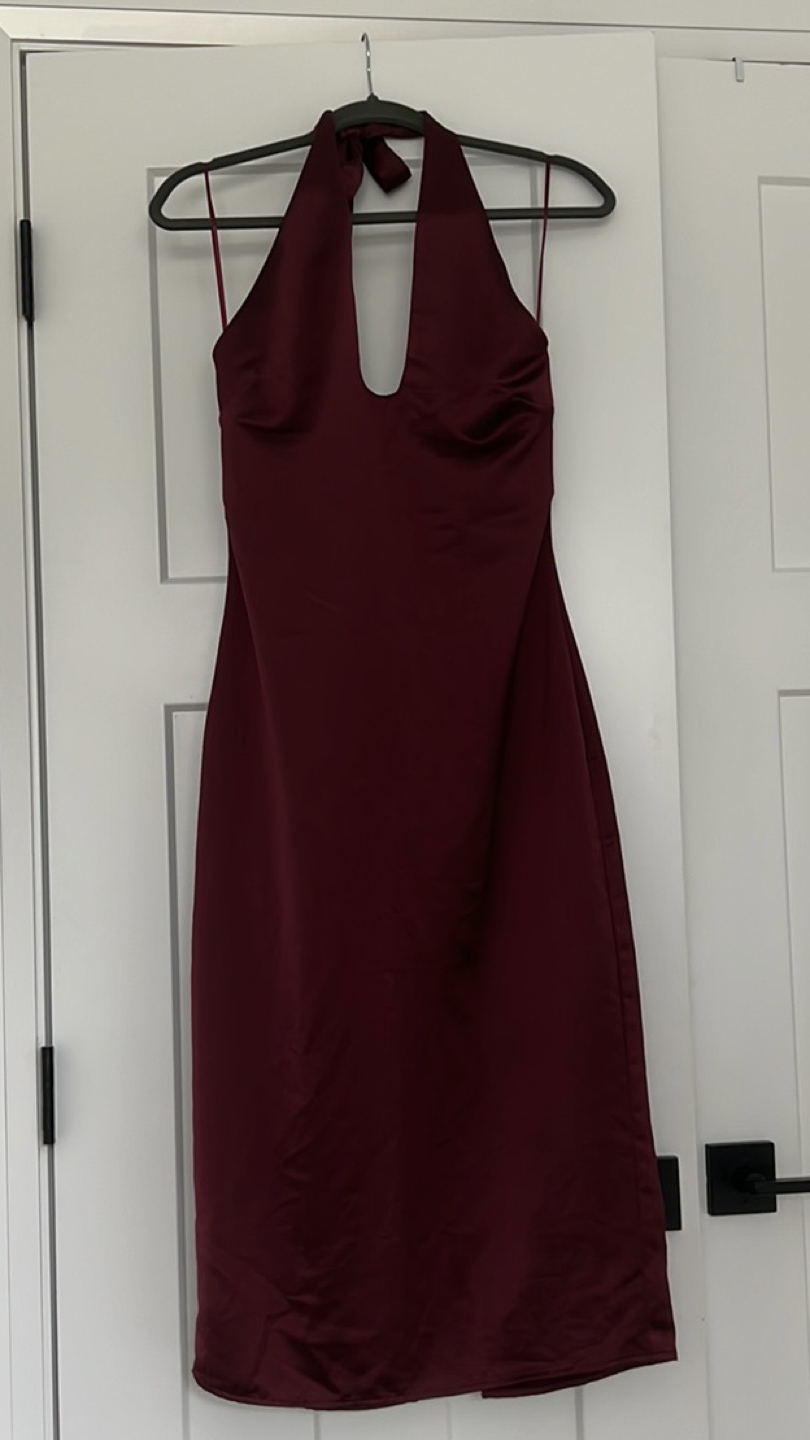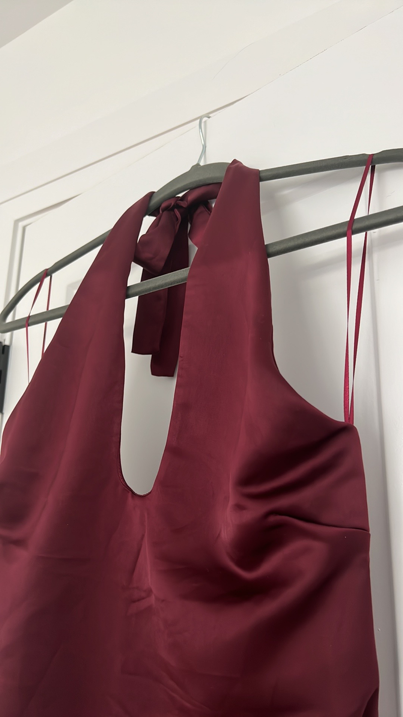 Halter dress, cocktail dress, open shoulders, a bow around the neck, sleeveless, atlas, silk texture, dark red, wine color.