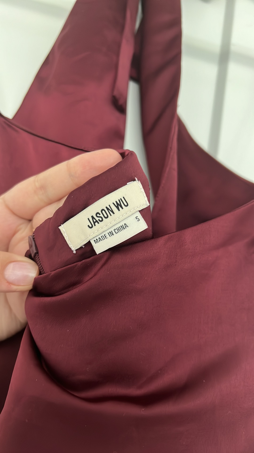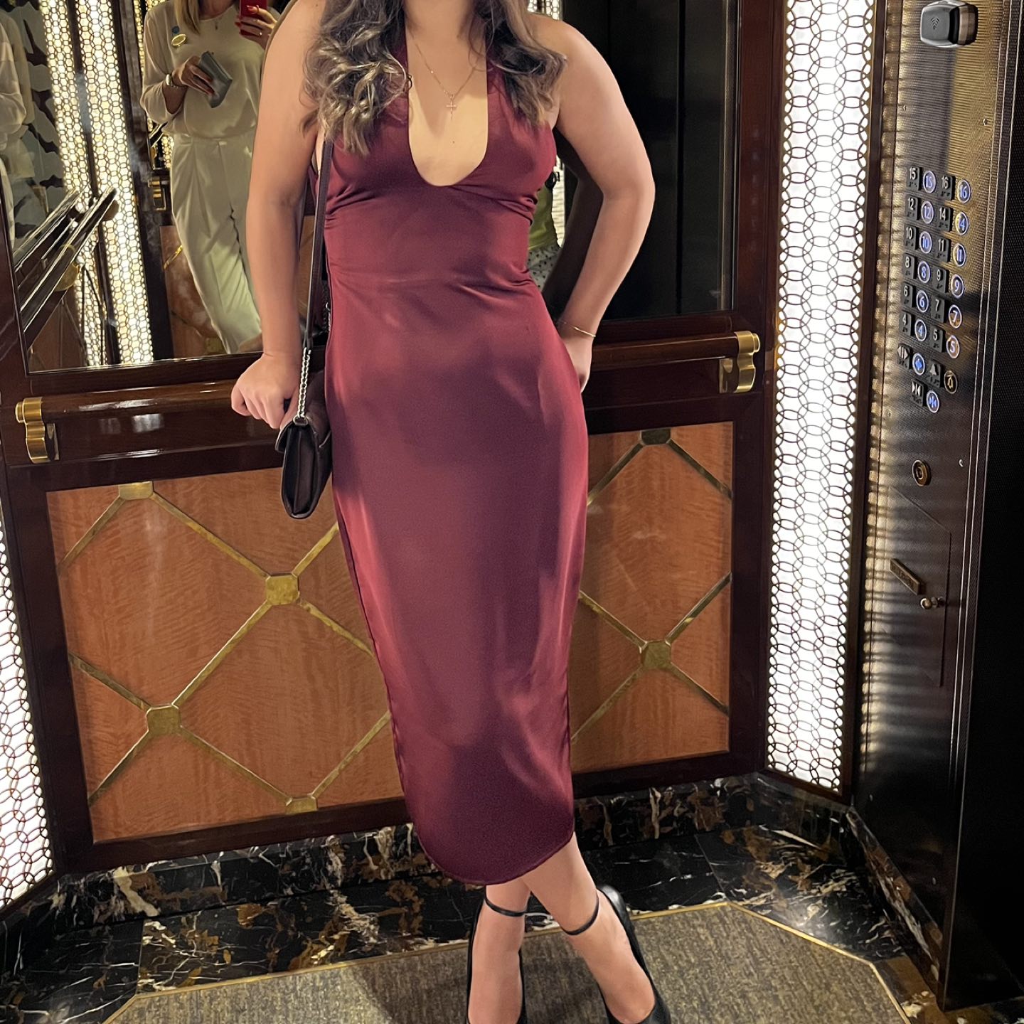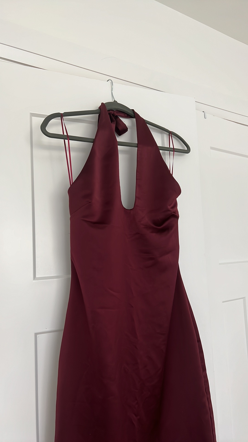 Halter dress, cocktail dress, open shoulders, a bow around the neck, sleeveless, atlas, silk texture, dark red, wine color.