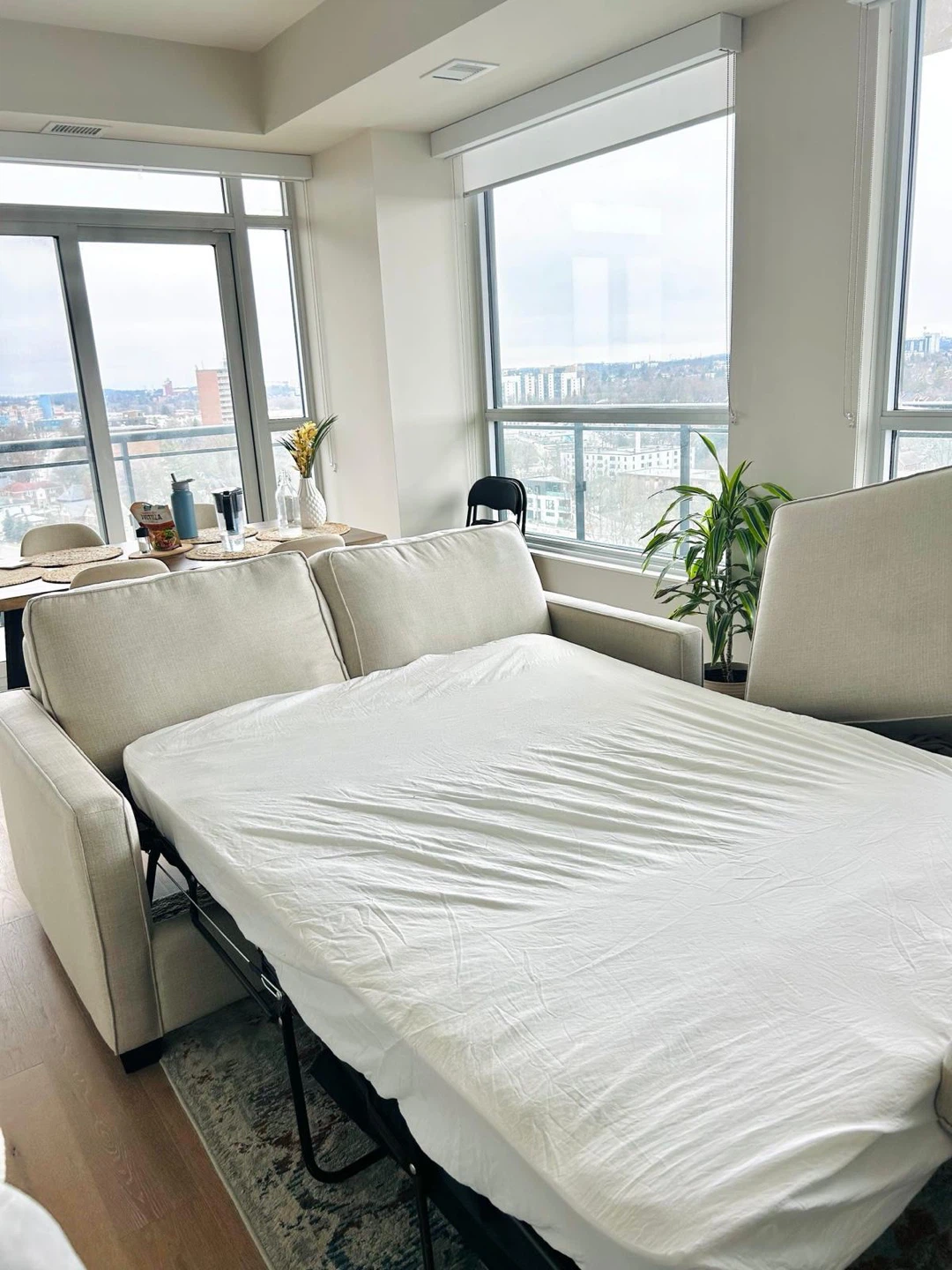 Selling a sofa bed in good condition. It's a neutral beige color that would fit in well with most decor. It easily converts into a bed, perfect for guests or small spaces. Incudes the Ikea coffee table black. Feel free to reach out with any questions!