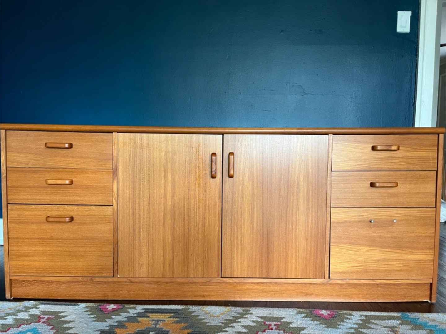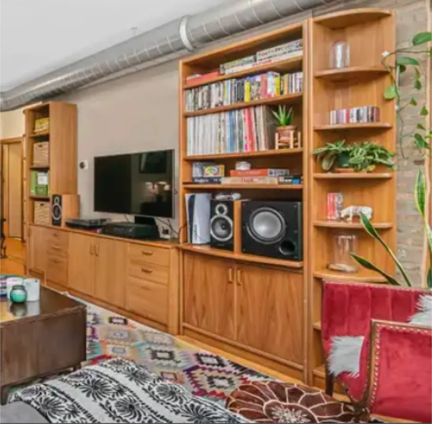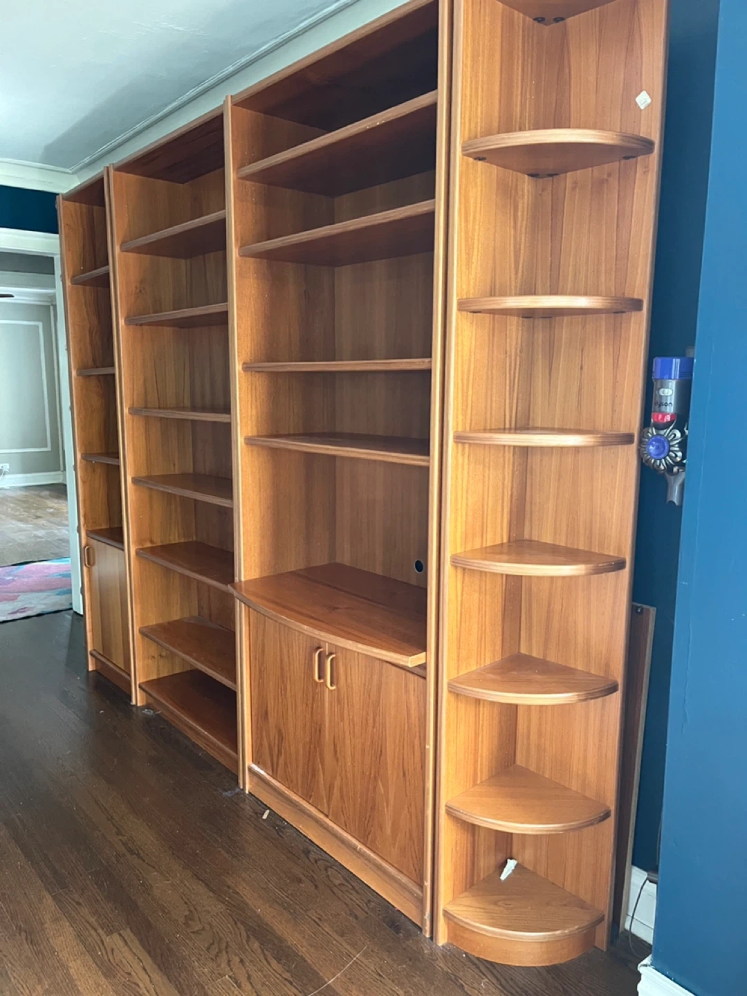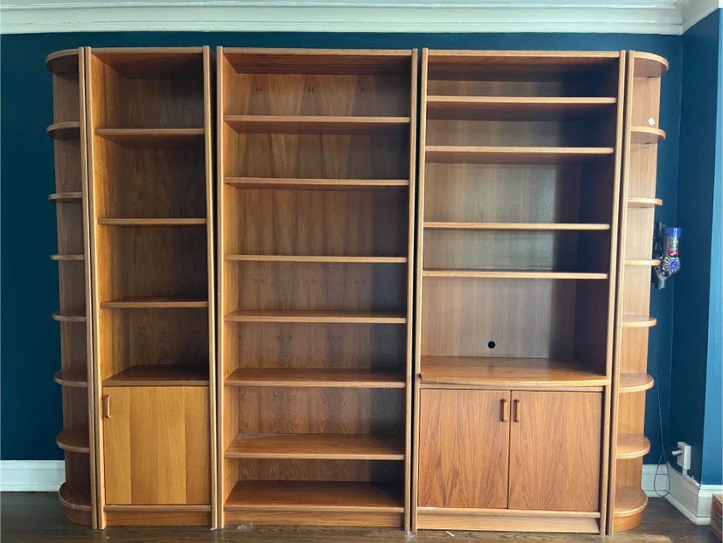 Consists of 3 bookshelves, 2 small display shelves, and a large credenza. They can be arranged in any order. Tons of storage. Bookshelves are adjustable and sturdy enough to hold records, etc.