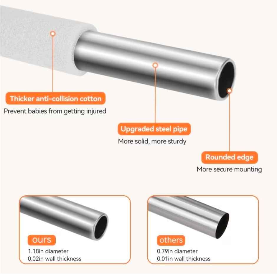 The playpen's structure is stable with thickened steel pipes, upgraded connectors, and strong suction cups. The 150D Oxford cloth and inner cotton cover are tear-resistant, plus there's pad corner protection.