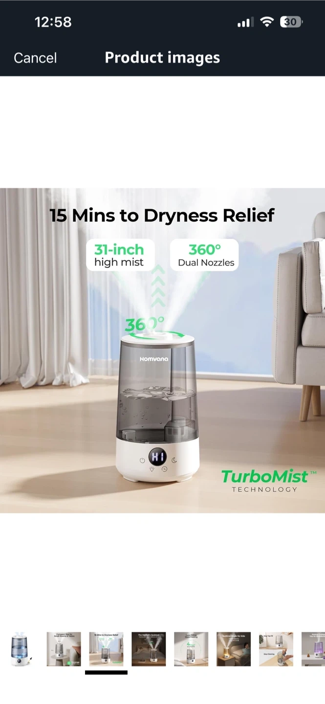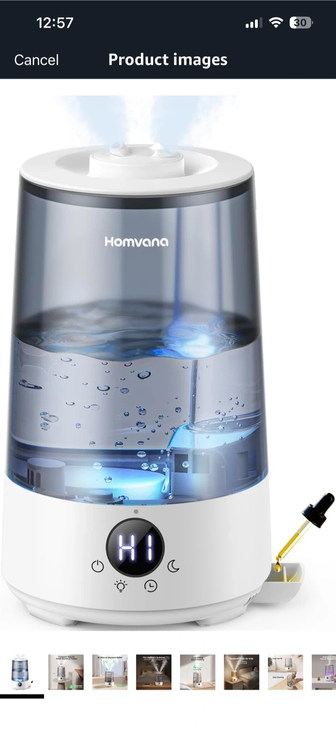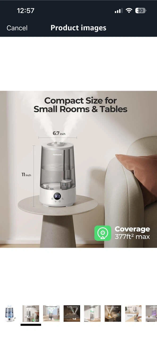I'm selling a humidifier! It's a compact size, perfect for small rooms and tables. It can cover up to 377ft² max. It also has TurboMist technology. It can provide dryness relief in 15 minutes with 360° dual nozzles. It is very quiet and improves your sleep in absolute silence