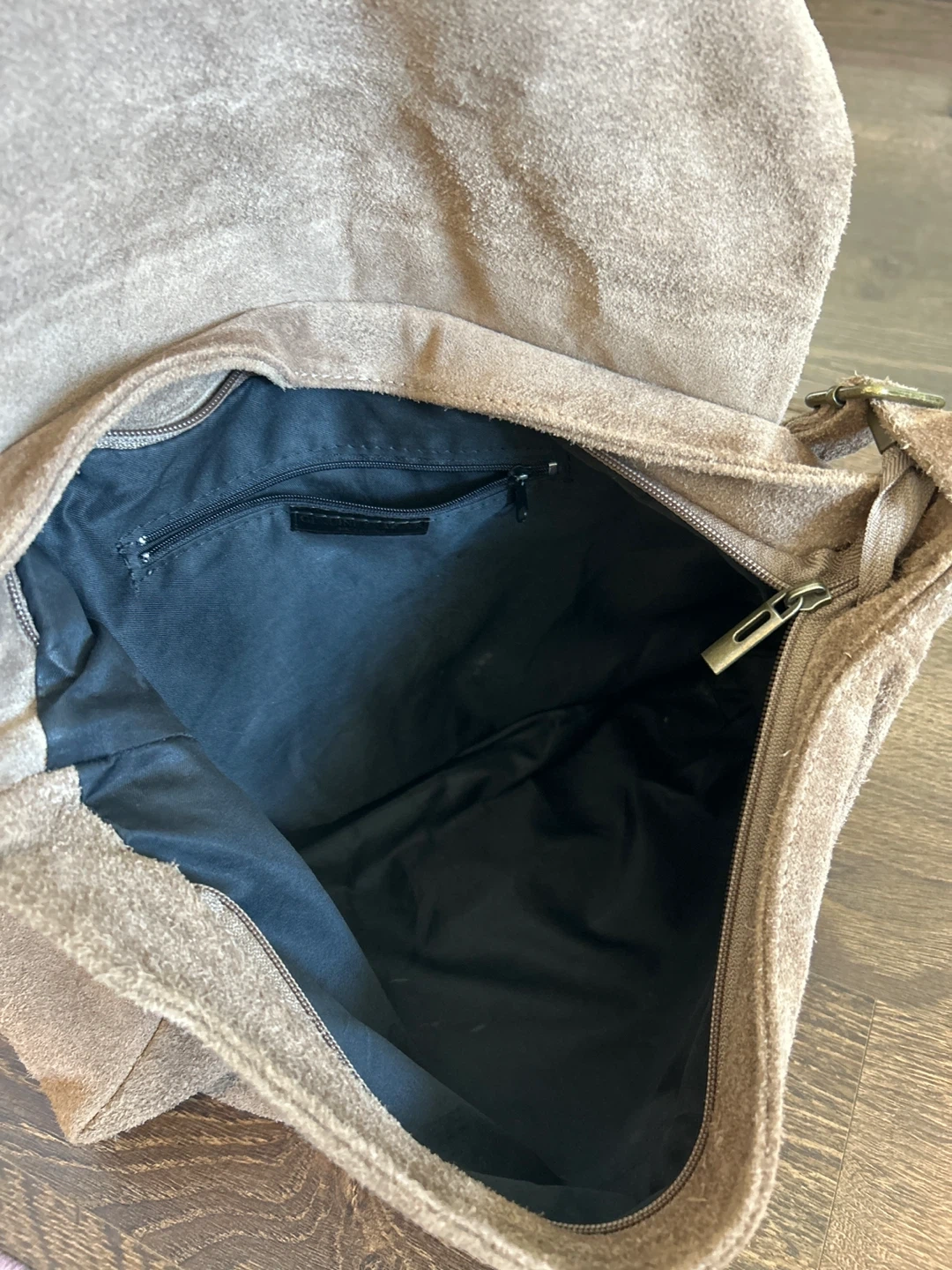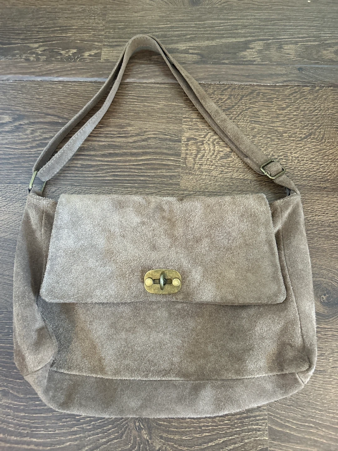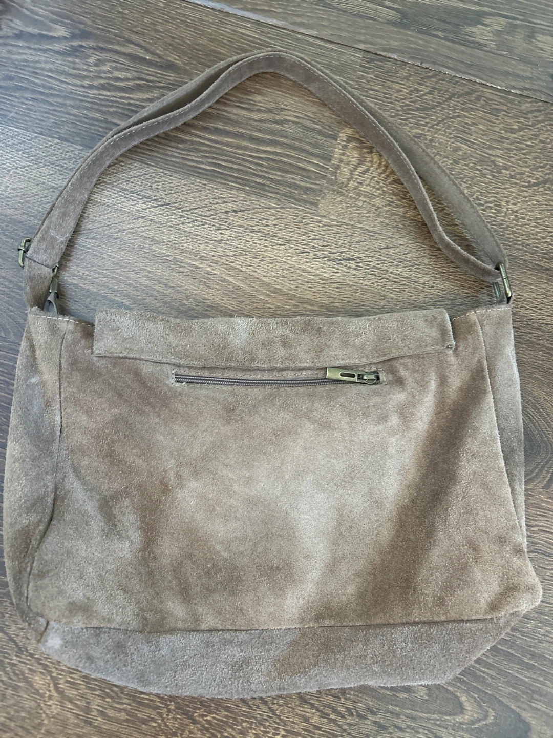 A lovely suede shoulder bag in a neutral brown colour. It's in great condition and perfect for everyday use. The bag features a flap closure and a convenient shoulder strap. Inside, there's a zipper pocket for keeping your essentials organized. Adjustable shoulder strap can be worn crossbody. Fits a 15” lap top. New, Never used. 100% genuine suede material. From Italy.