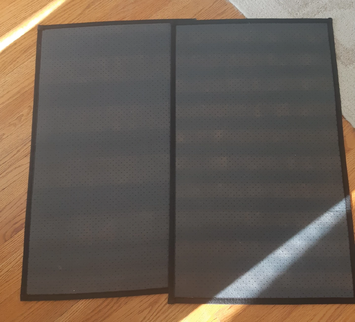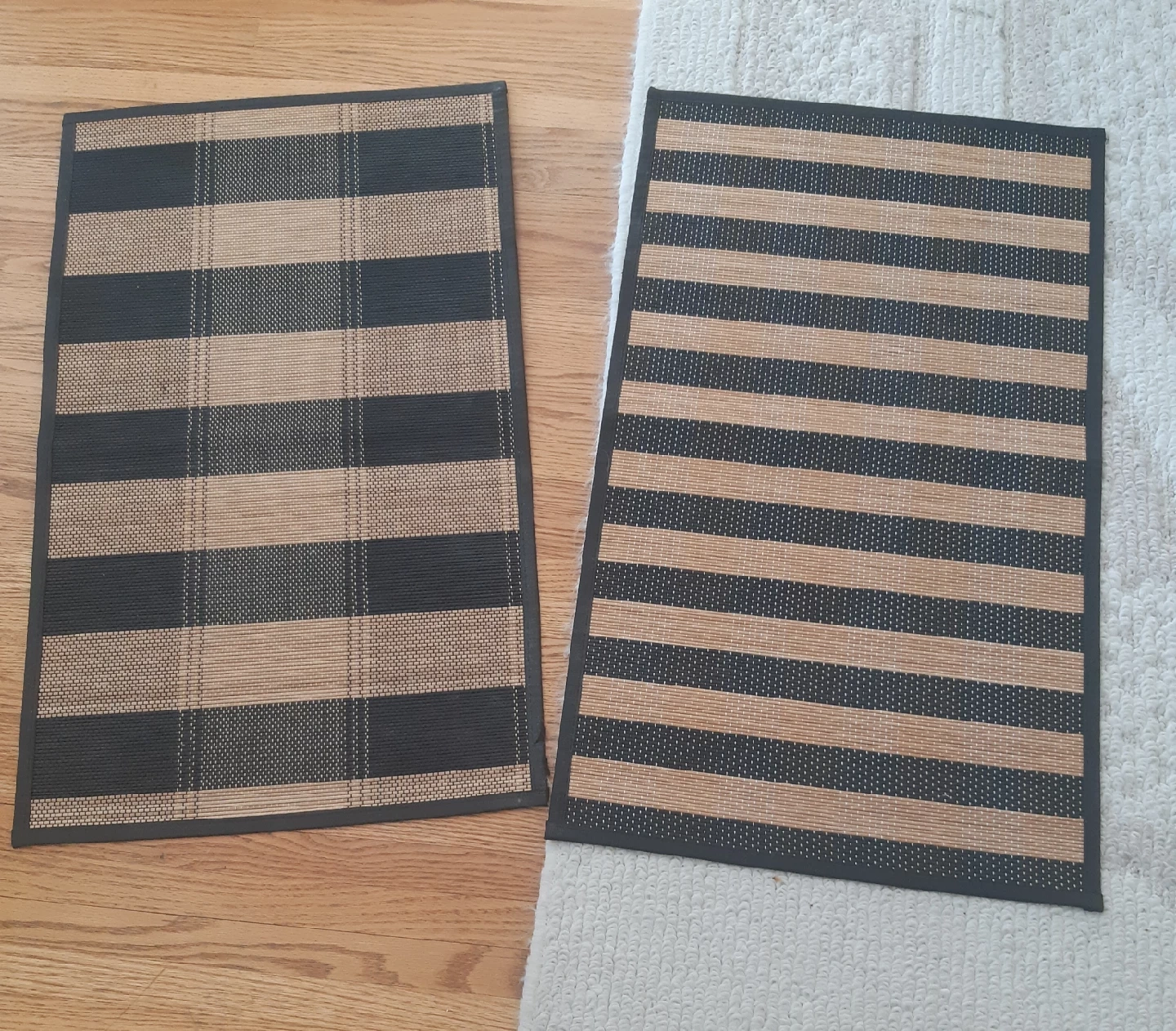 Give away a set of two floor mats. They feature a striped design in navy blue and beige/tan. Perfect for any area, by the bed, at the main door, a shoe mat, etc, etc. Has a cloth backing as well. Size approx. 30" X 19"