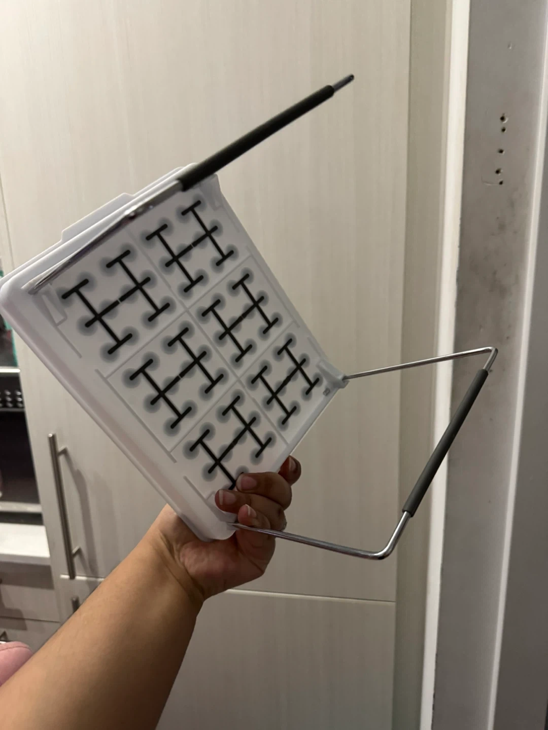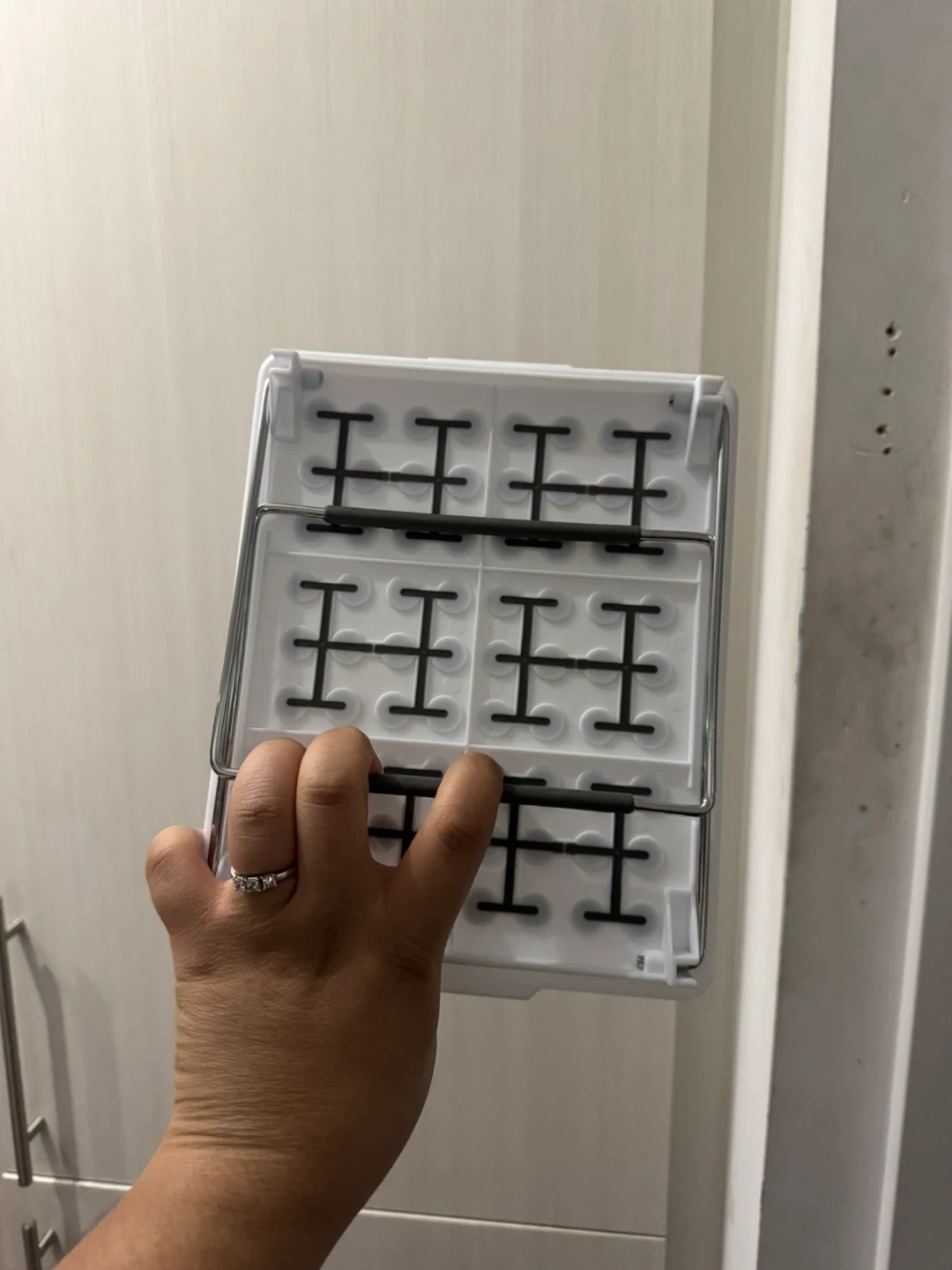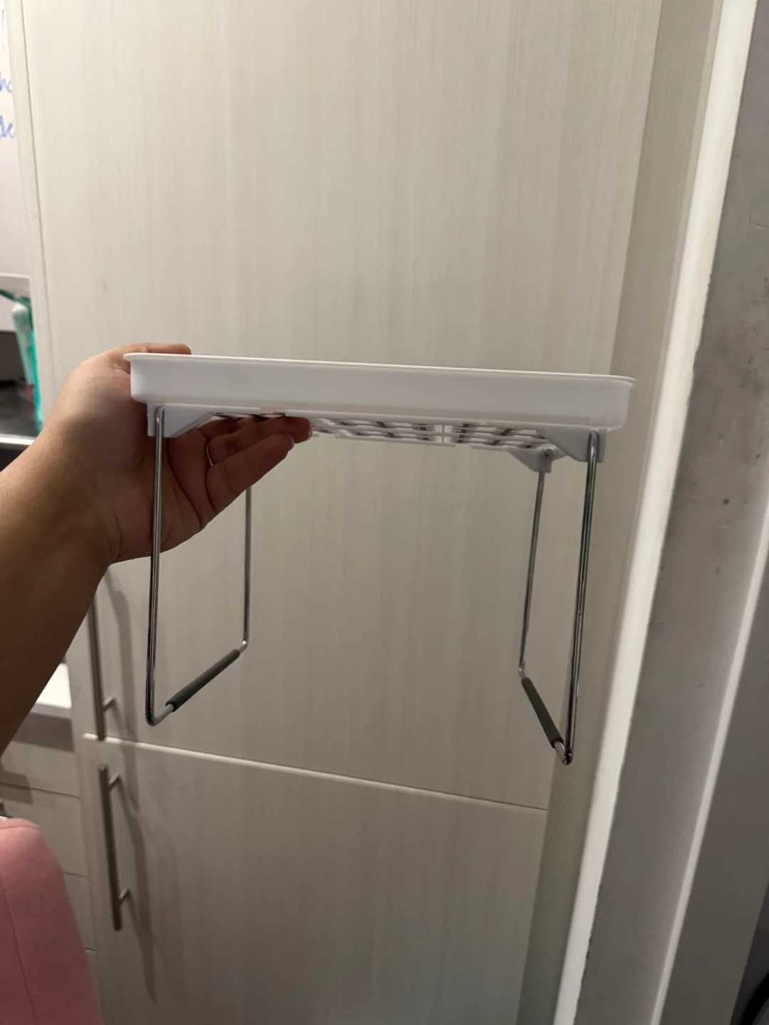 This is an adjustable shelf organizer, perfect for adding extra storage space in your kitchen, bathroom, or closet! It's white and in great condition, ready to help you get organized.