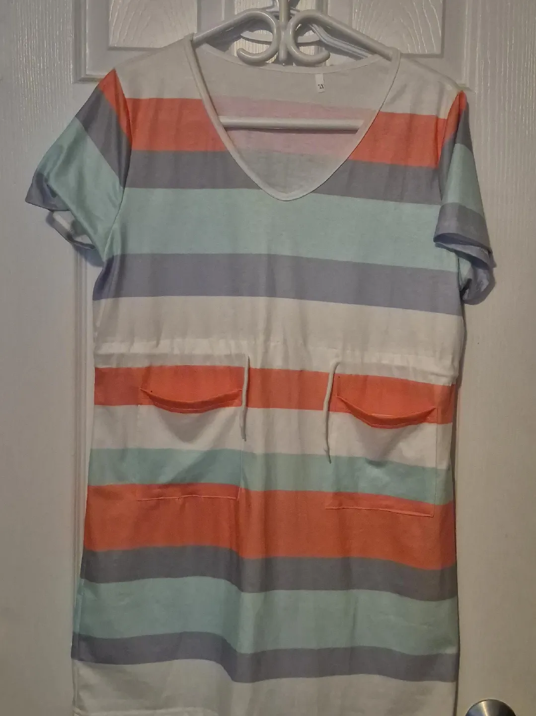 Here's a cute and comfy striped dress! It features a V-neck and short sleeves, perfect for warmer weather. The stripes are in a mix of colours, including coral, grey, and aqua. It also has two little pockets on the front with drawstring detail. Size is XL
