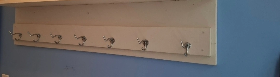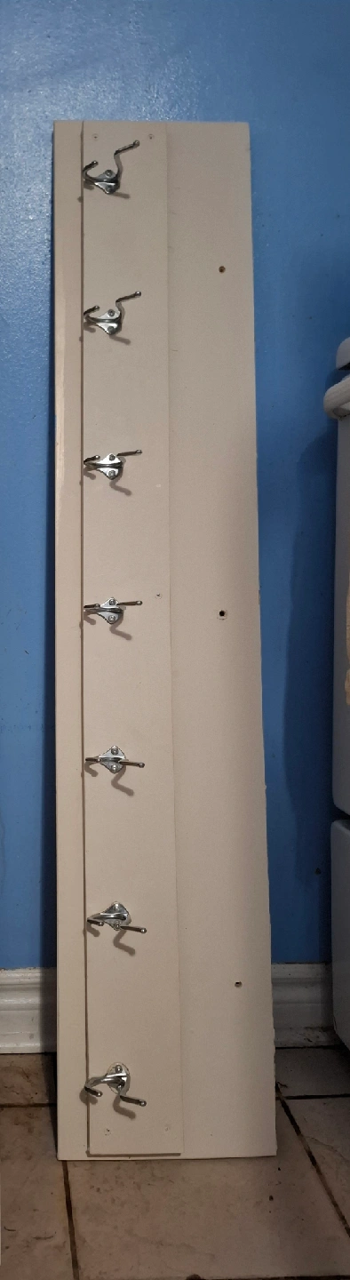 Here's a handy wooden coat rack with seven sturdy hooks! It's perfect for keeping your entryway or mudroom organized. The rack is a neutral colour that will fit in with most decor styles. It's in good condition and ready to use