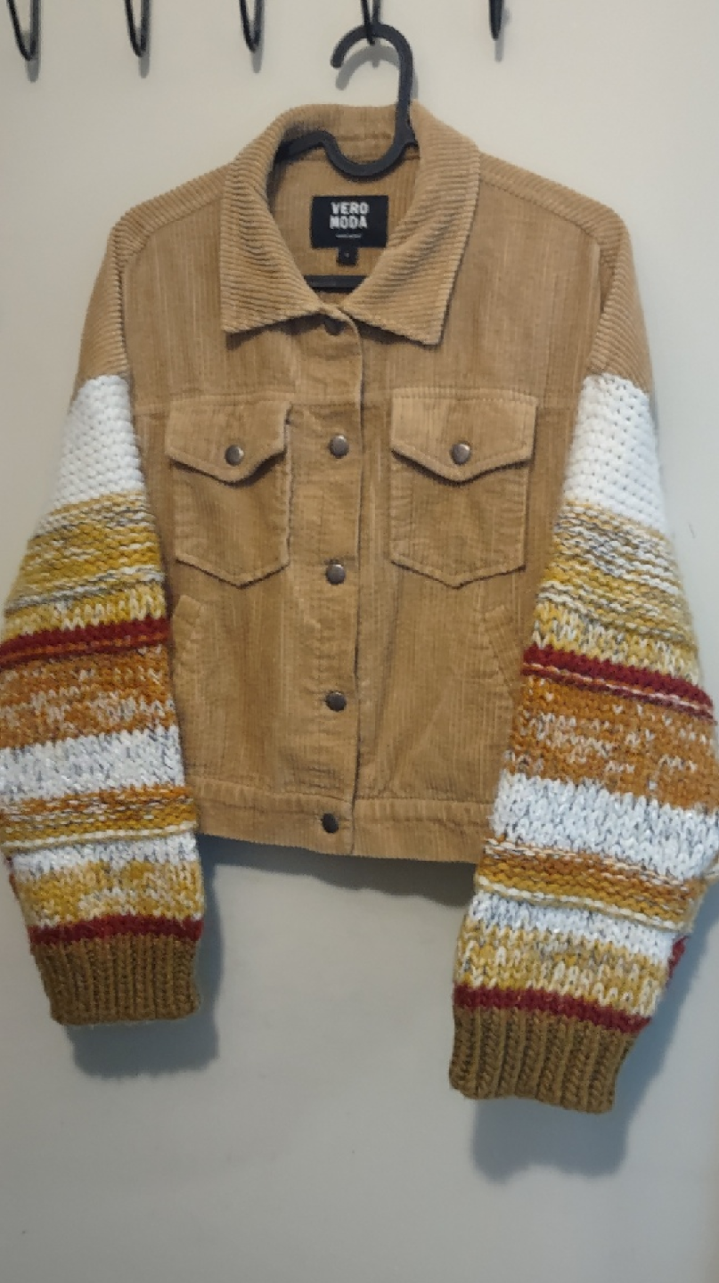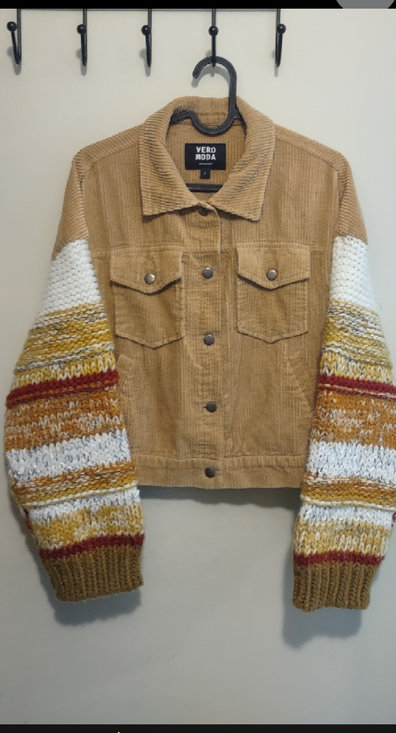 Selling a Vero Moda corduroy jacket! It's a size small and features a unique design with knit sleeves. The jacket is in great condition and ready for a new home. The neutral colour makes it super versatile too!