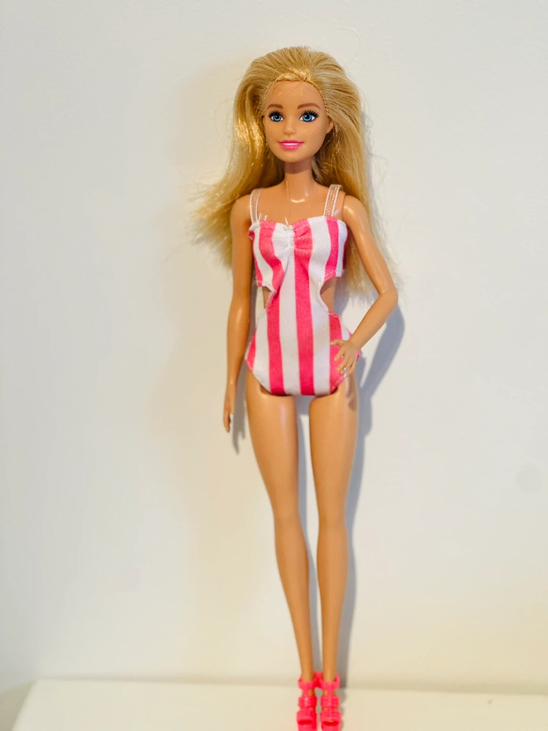 Selling a Barbie doll dressed in a cute pink and white striped swimsuit and matching pink heels! She's ready for a fun day at the beach or pool. Great for collectors or kids who love to play with dolls