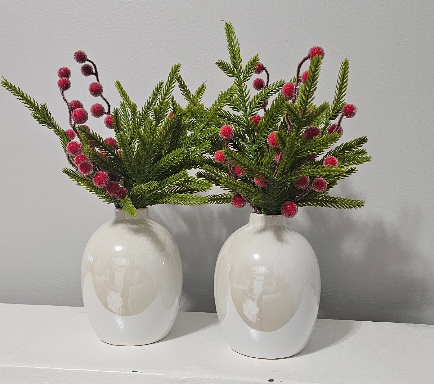 These are two lovely Christmas floral arrangements in white vases. They're perfect for adding a festive touch to your home this holiday season! The arrangements feature faux greenery and red berries, creating a classic Christmas look