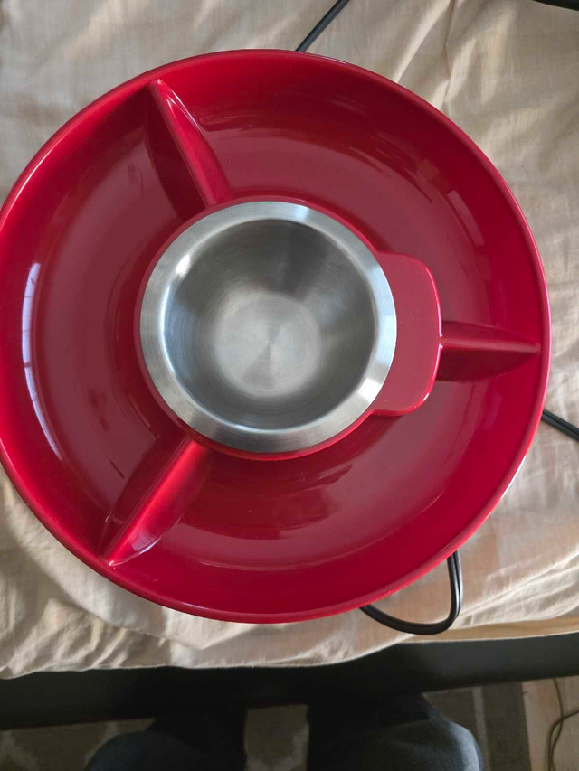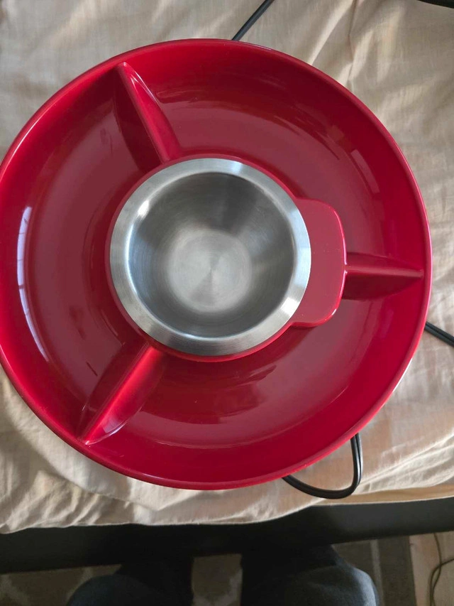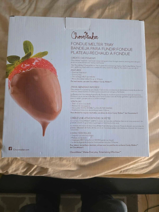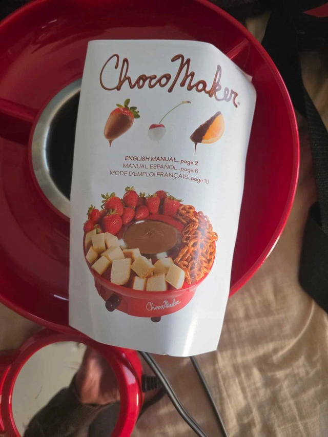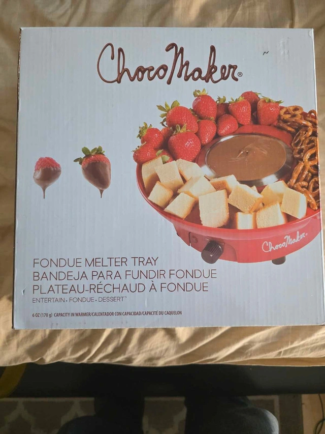 Indulge in sweet treats with this Choco Maker fondue set, perfect for creating delicious chocolate-covered snacks right at home. This set includes the fondue melter tray with a 6-oz capacity warmer, ideal for entertaining and dessert nights. It is in new condition, complete with the original box and manual. This fondue set is looking for a new home where it can create lots of fun memories. Don't miss out—if the ad is up, it's available!