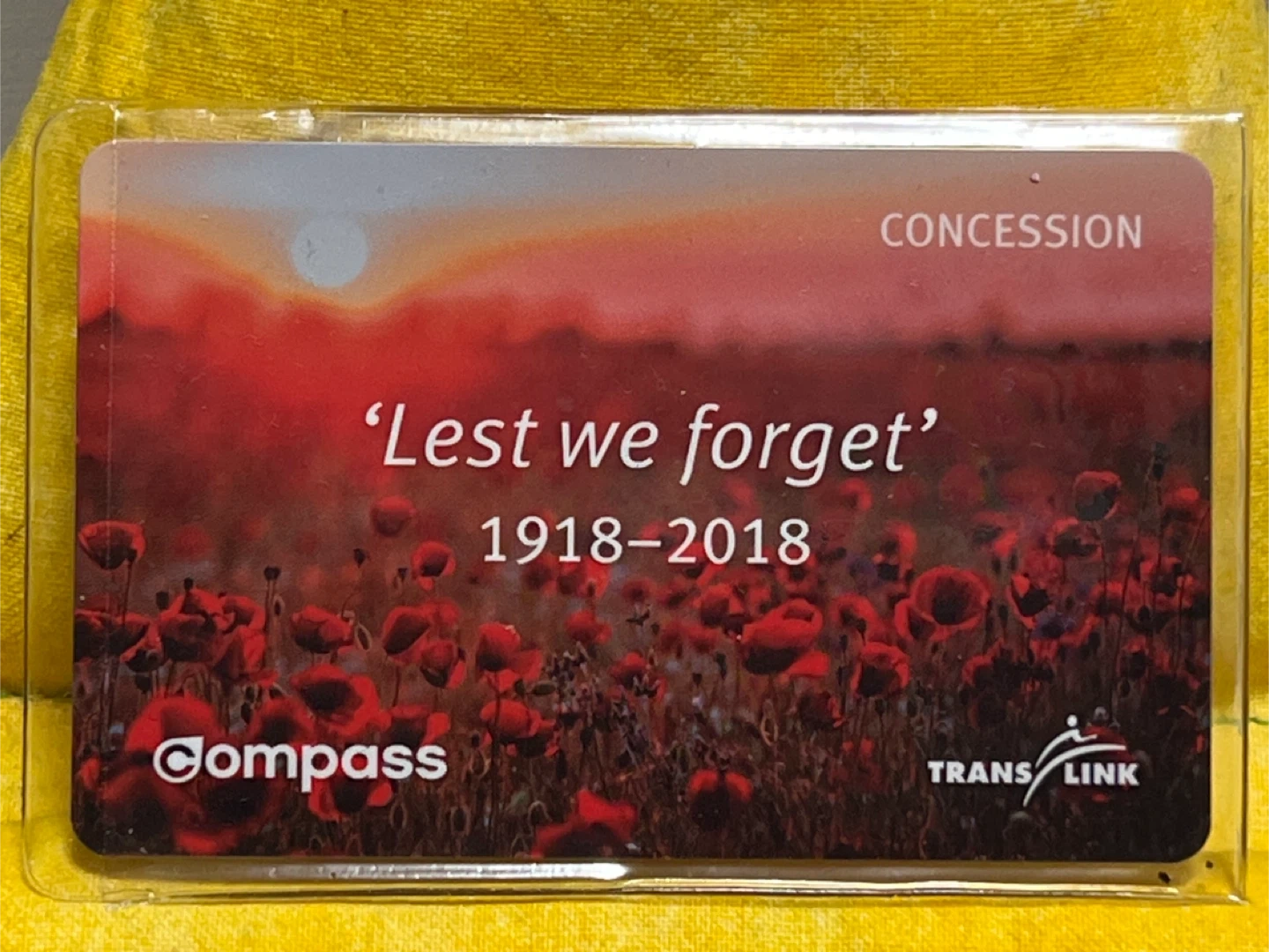 Selling a TransLink Compass Concession Card. It features a poppy design with 'Lest we forget' and '1918-2018' printed on it