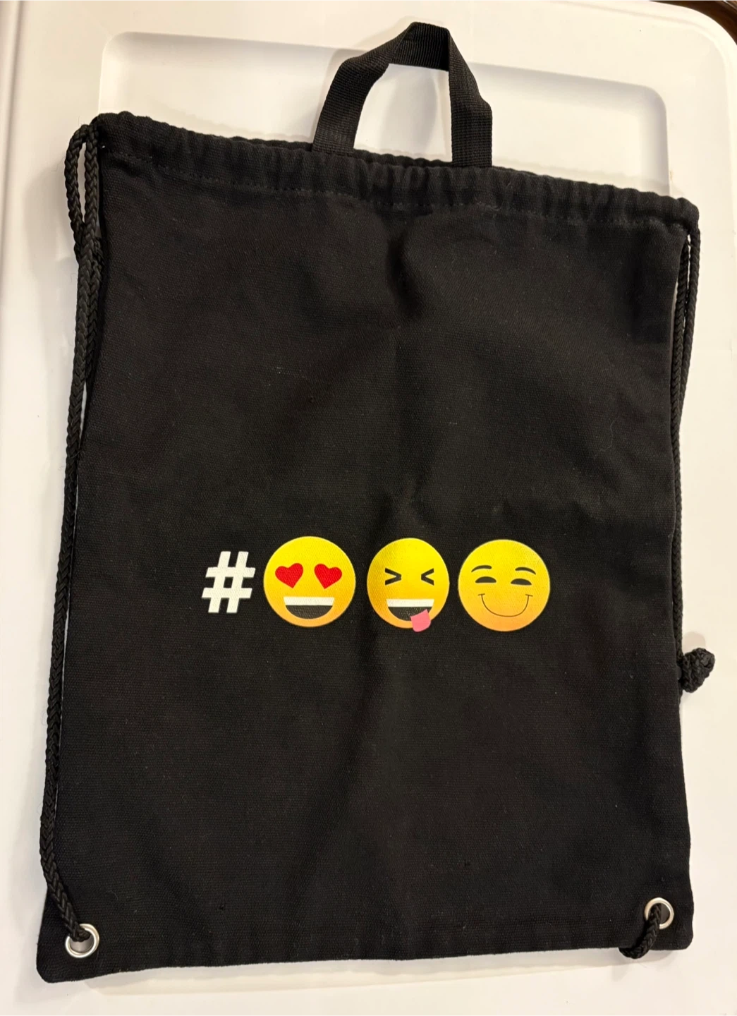 Selling a black drawstring bag featuring a fun emoji design! It's perfect for carrying your essentials and adding a bit of personality to your day. Great condition and quality 😊