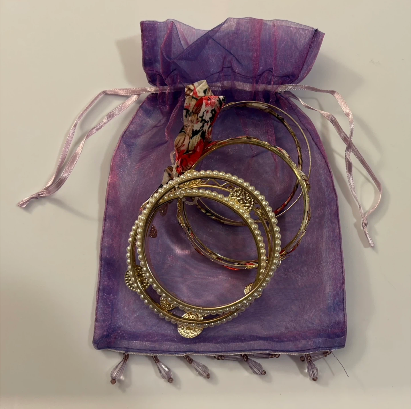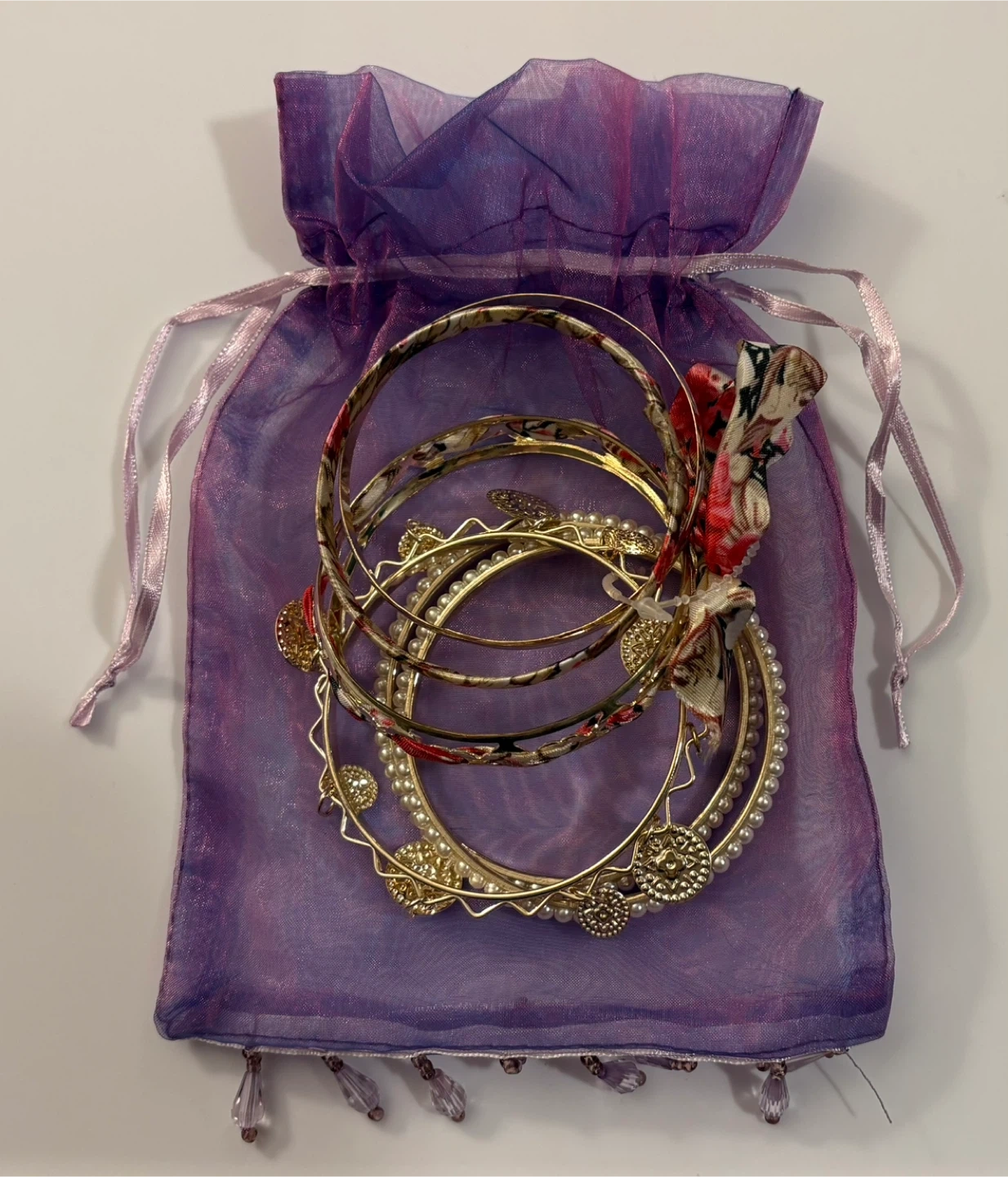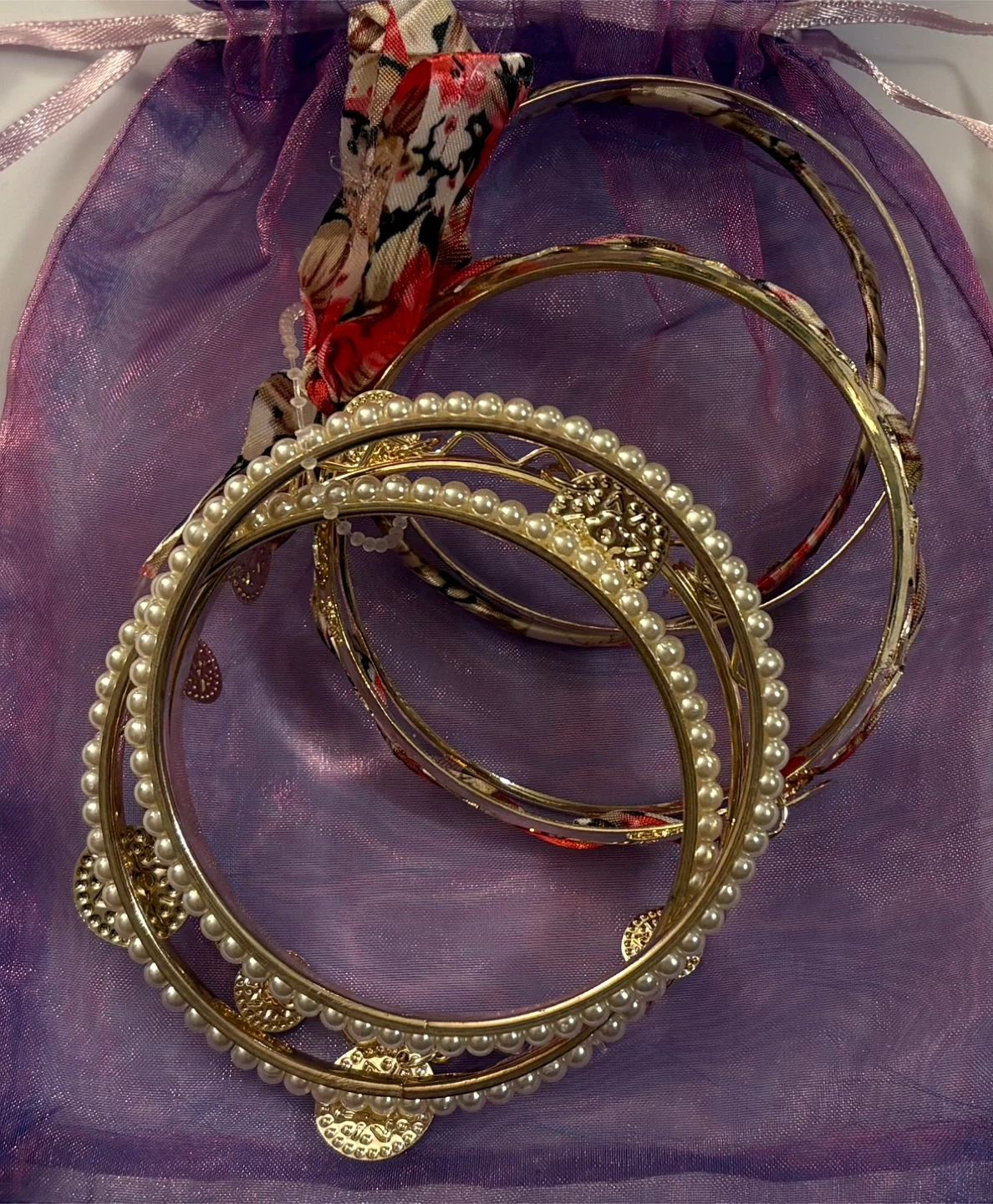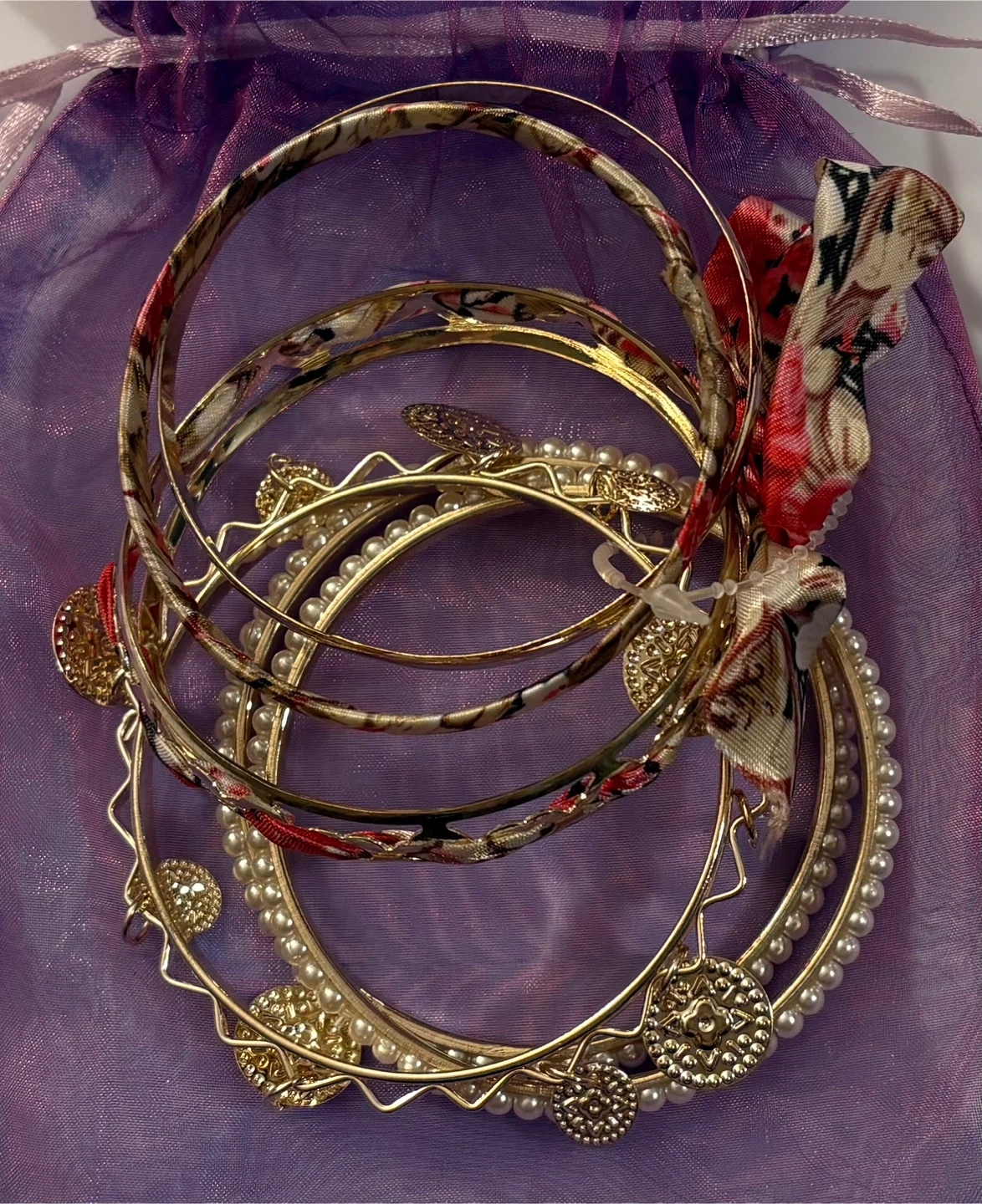 Selling a set of gold-tone bangles! These come in a cute purple drawstring bag. The bangles have different designs, including faux pearls and floral patterns. They're in great shape and ready for a new home! 😊