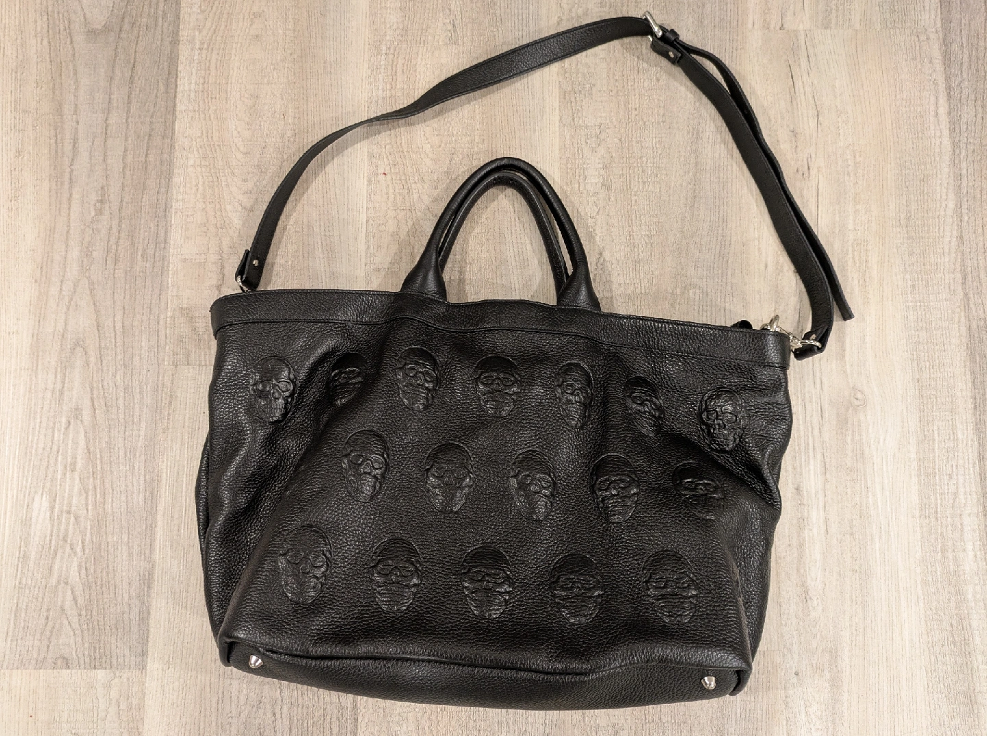 Gorgeous real Italian leather purse with 3D skulls embossed all over it. Used a couple of times but I just don't use a bag that big often enough to justify keeping it. has sturdy handles and a cross body strap. Zippered main compartment to keep your belongings secure. big enough to use as an overnight bag or to bring your laptop to work. brand is Iopelle Italia