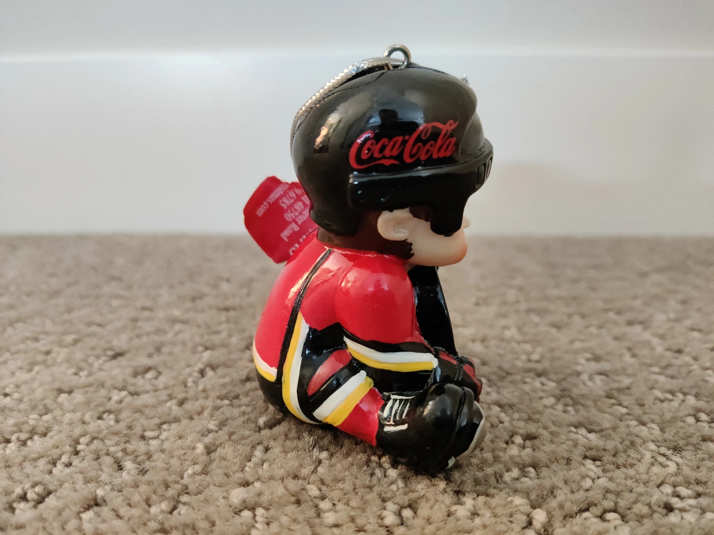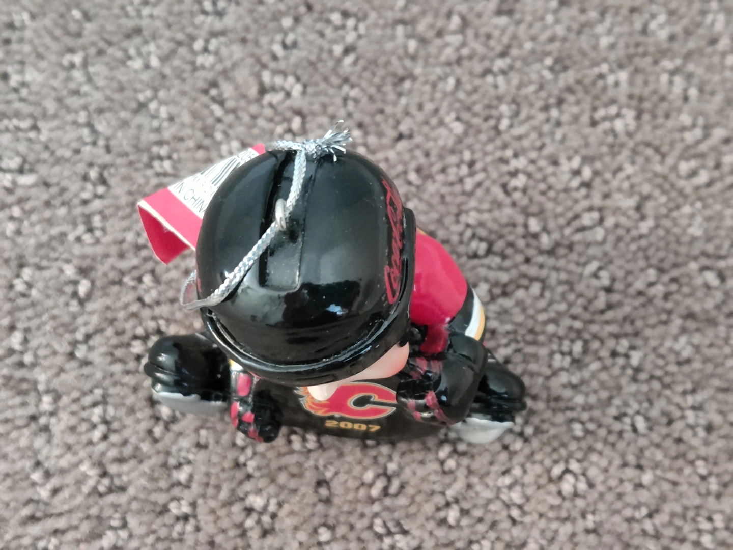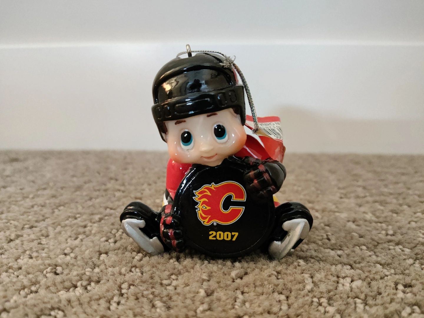 I am selling Calgary Flames - NHL Hockey Lil Player Christmas Holiday Ornament in like-new condition. Holding a hockey puck with the Calgary Flames Logo; has the Coca-Cola logo on the helmet, and wearing an unmarked Calgary Flames jersey. Christmas tree ornament, officially licensed by the NHL. Made from hard resin with a silver cord hanger.