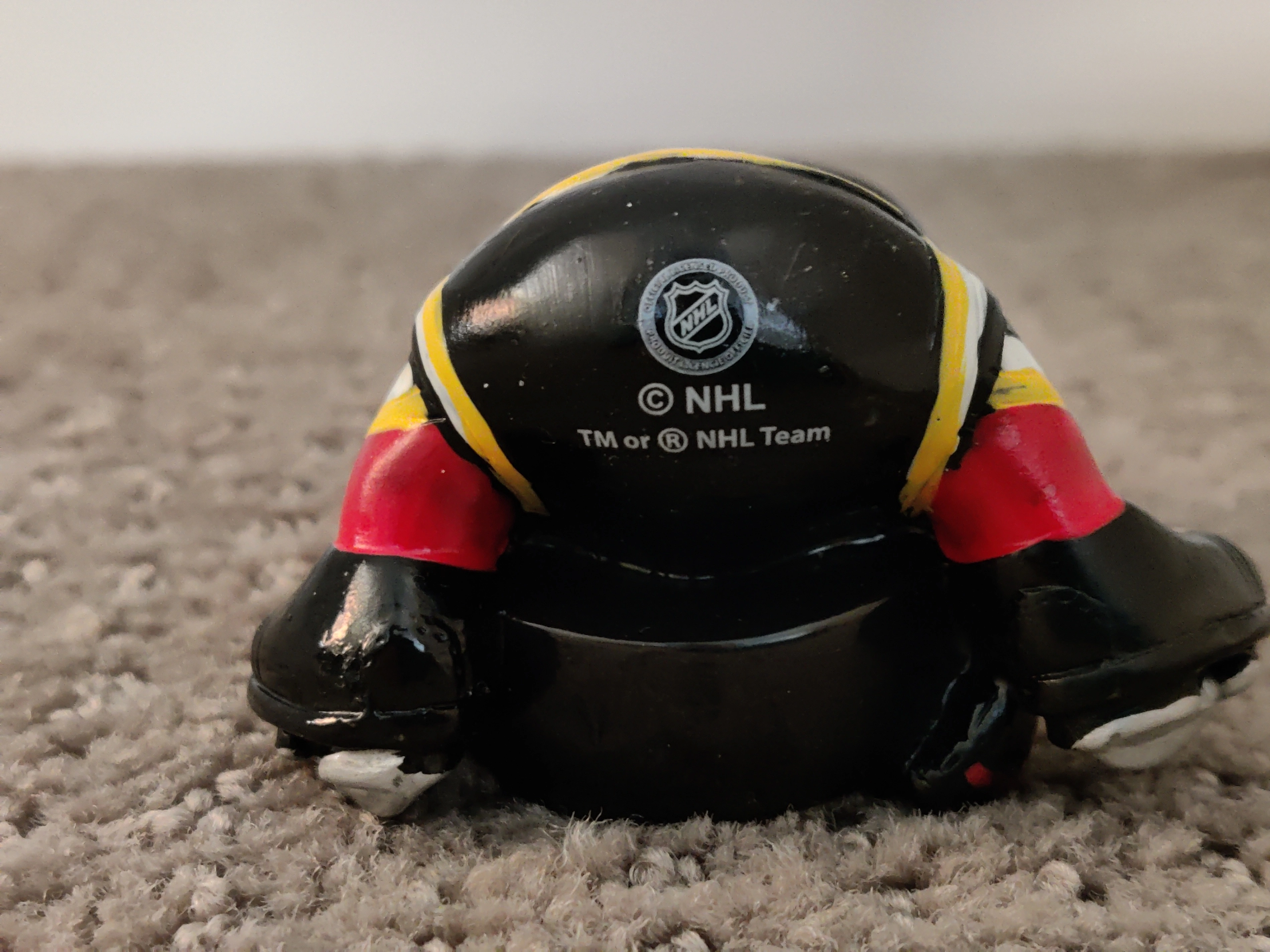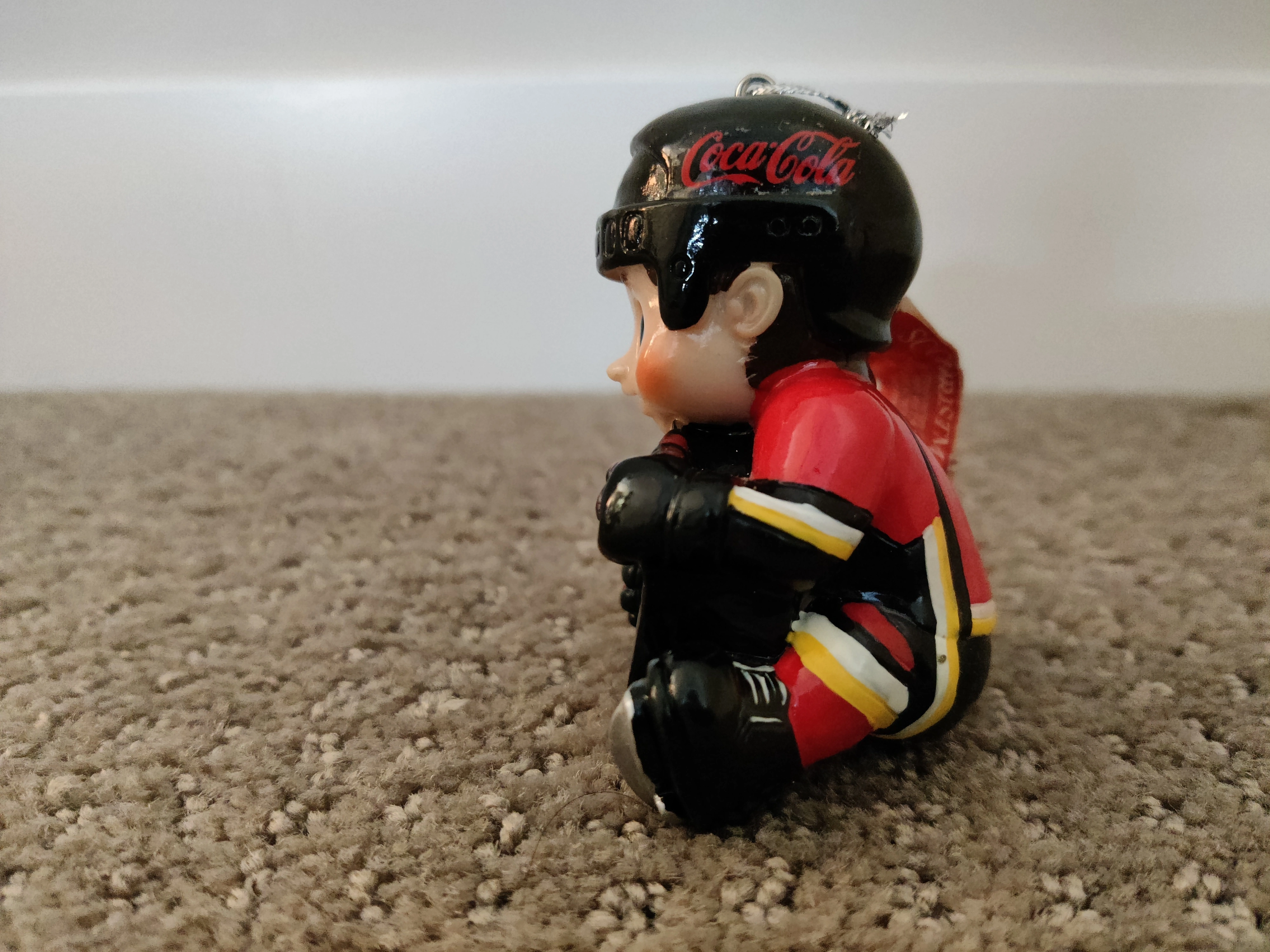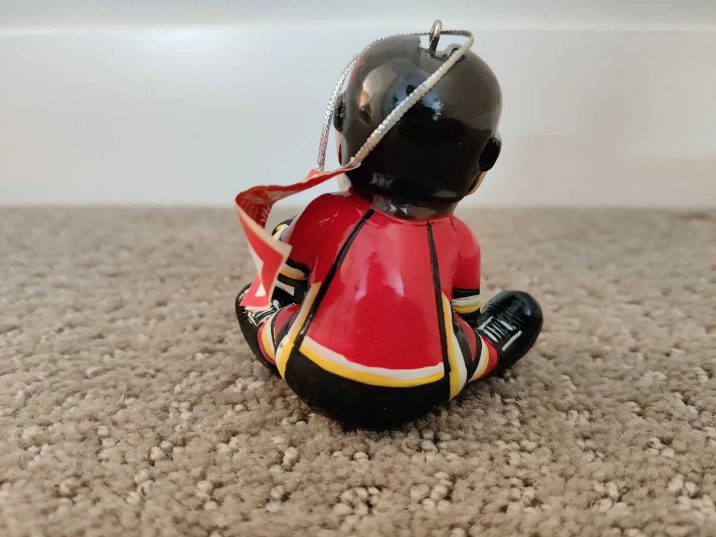 I am selling Calgary Flames - NHL Hockey Lil Player Christmas Holiday Ornament in like-new condition. Holding a hockey puck with the Calgary Flames Logo; has the Coca-Cola logo on the helmet, and wearing an unmarked Calgary Flames jersey. Christmas tree ornament, officially licensed by the NHL. Made from hard resin with a silver cord hanger.