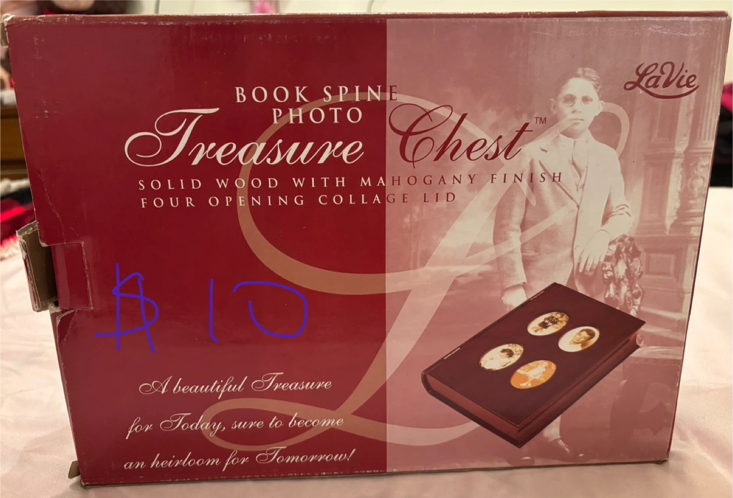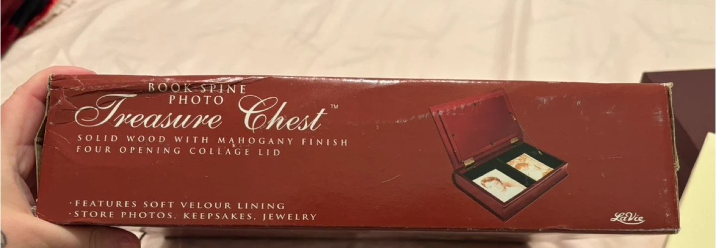 Selling a LaVie Treasure Chest photo box. It's a solid wood box with a mahogany finish and a four-opening collage lid. It features a soft velour lining, perfect for storing photos, keepsakes, and jewelry