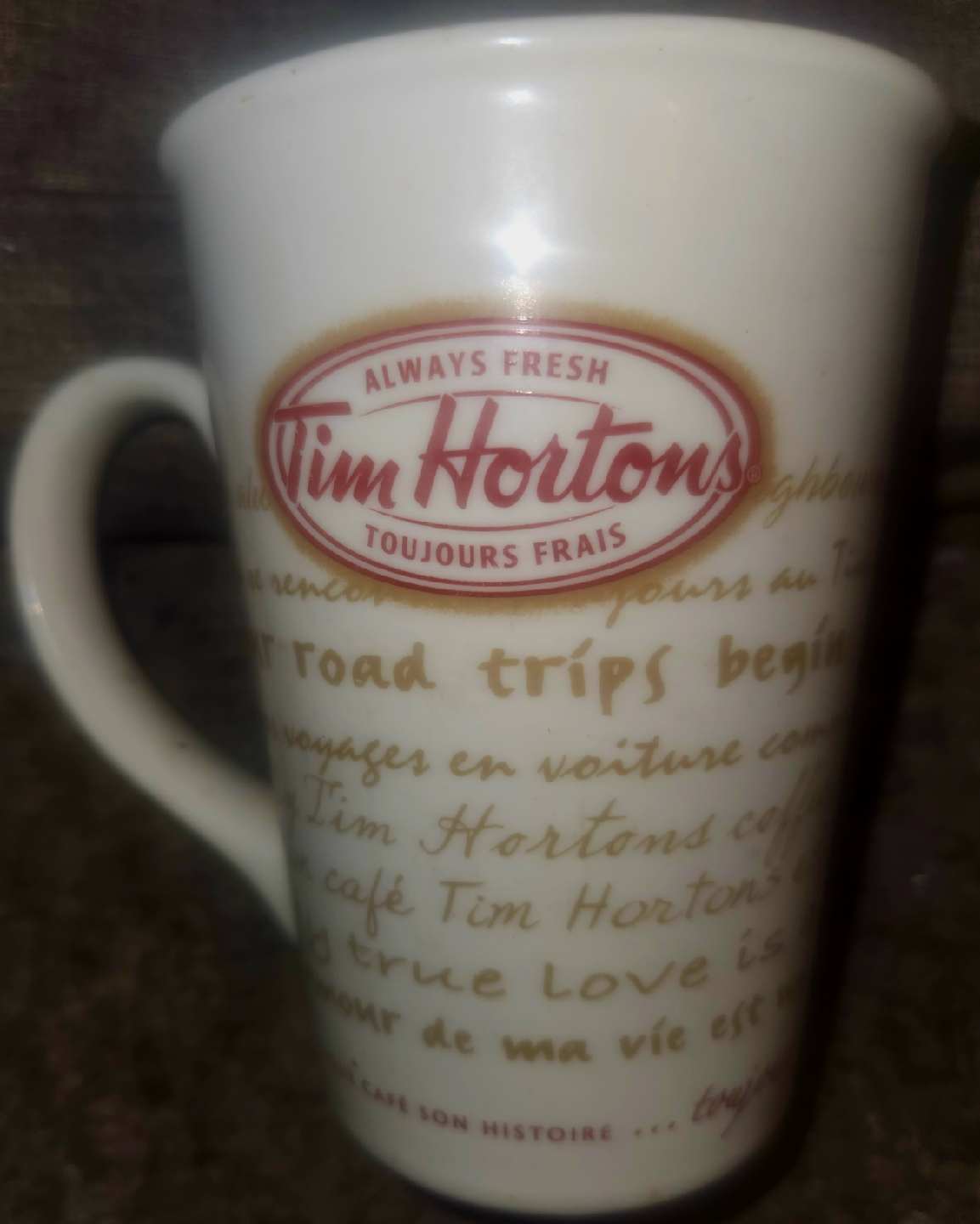 Selling a Tim Hortons limited edition mug! It's in great shape and ready for your morning coffee. Features the classic Tim Hortons logo and some fun writing about road trips and coffee. A nice addition to any Tim Hortons collection. Pick up only unless near intersection of Oxford and Gammage Street.