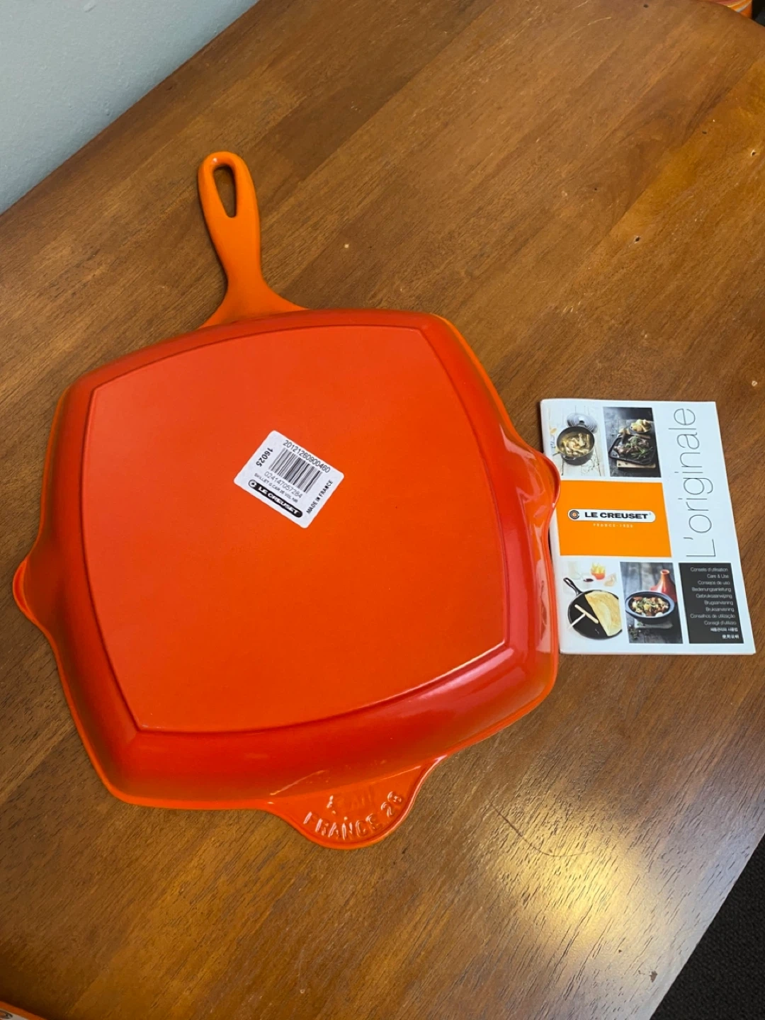 Selling a Le Creuset square grill pan in Flame orange. It's in great condition and ready for your grilling needs! The pan measures about 10.25 inches. Includes the original box and booklet. NEW IN BOX. Or BEST OFFER