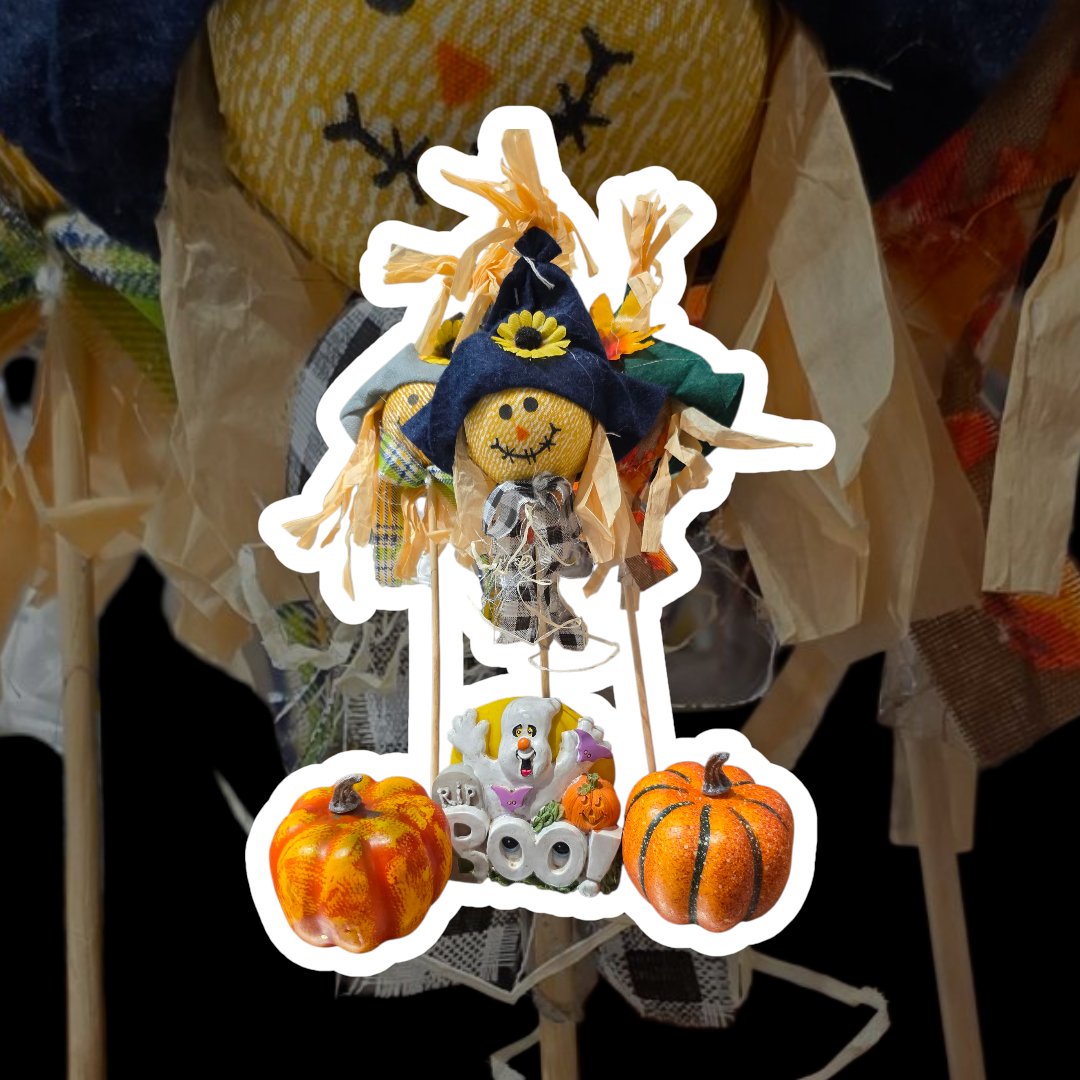 Cute Halloween decoration featuring scarecrows, a ghost, and pumpkins! Perfect for adding a festive touch to your home
