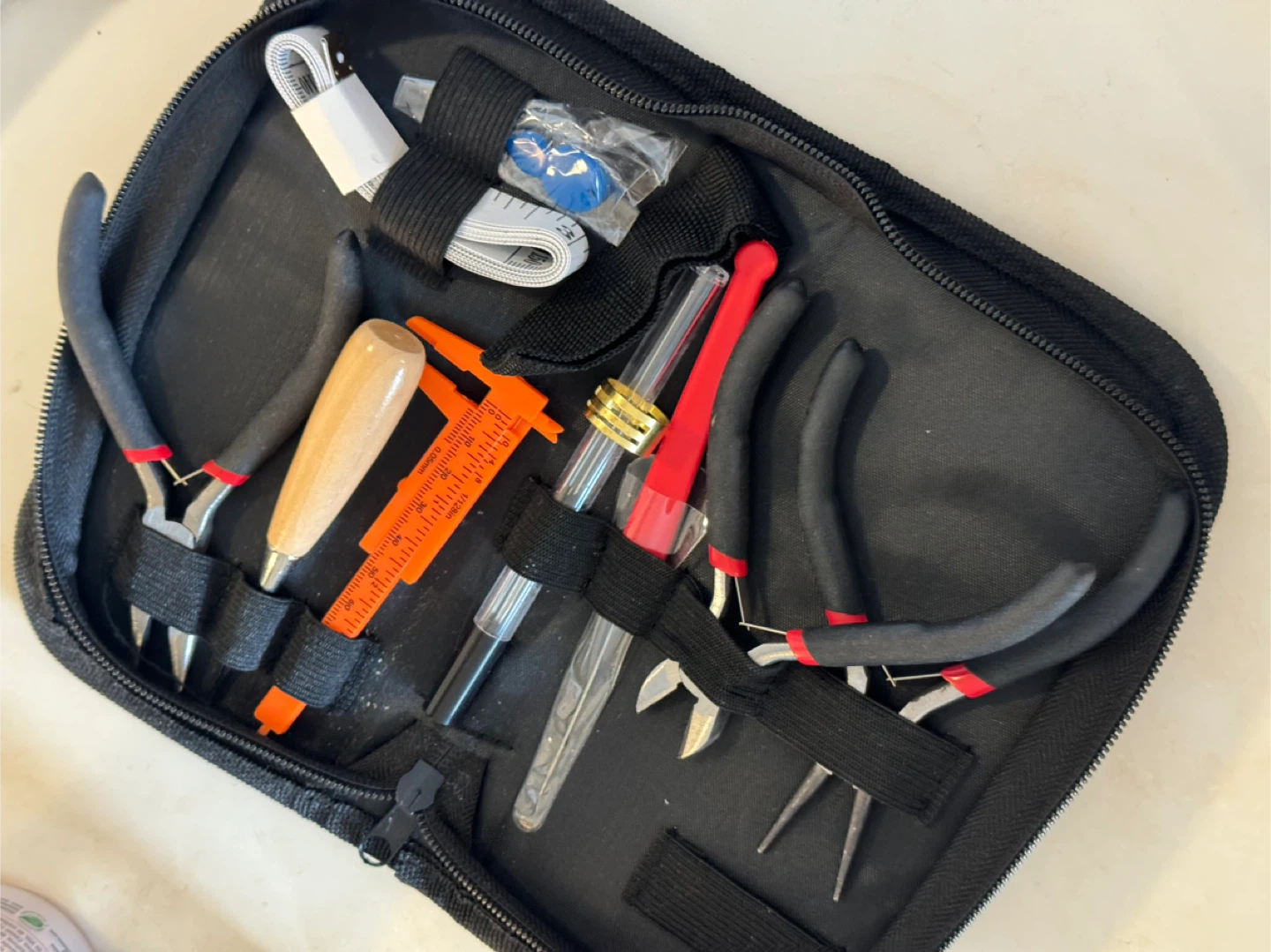Selling a jewelry making tool kit that comes in a handy black case. It includes various pliers, a measuring tape, and other useful tools for jewelry crafting. Perfect for beginners or experienced jewelry makers!