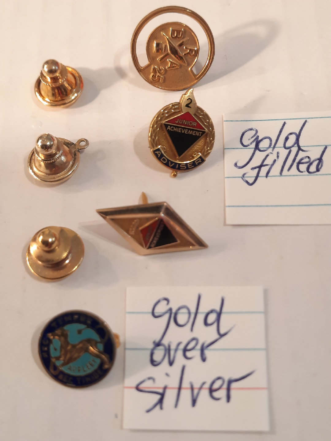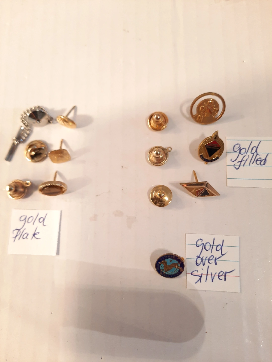 A collection of vintage lapel pins, some marked as gold plated, gold filled, or gold over silver. A variety of designs and styles included!10k12k gold filled,also some gold plate and one sterling silver. see all photos.