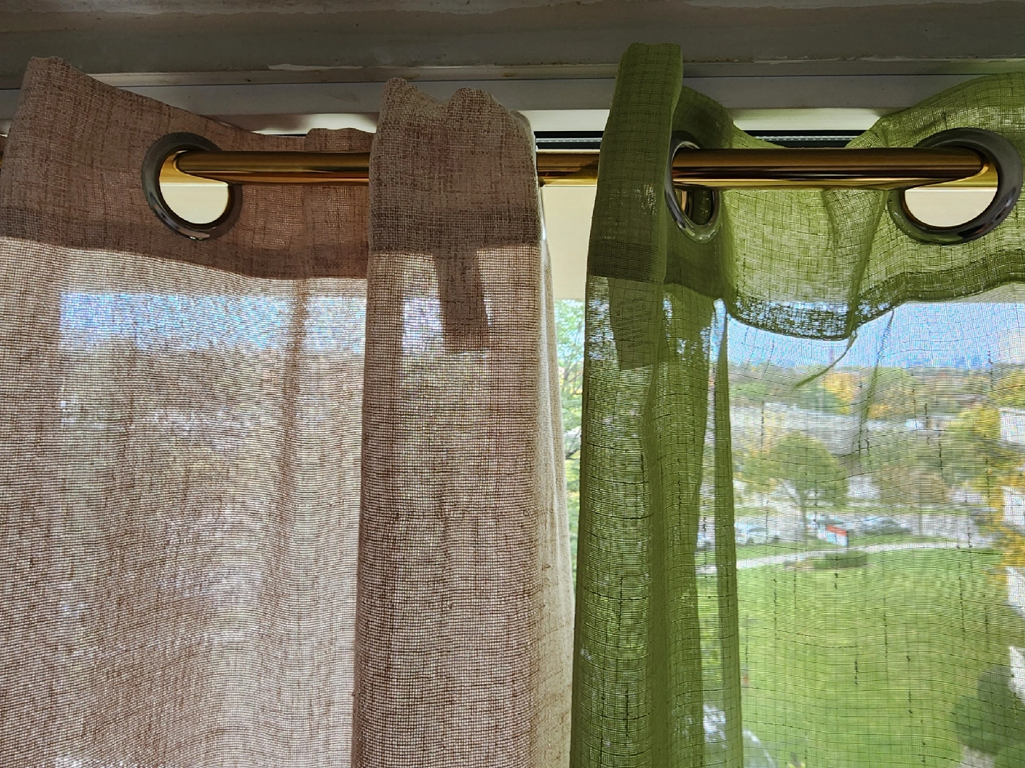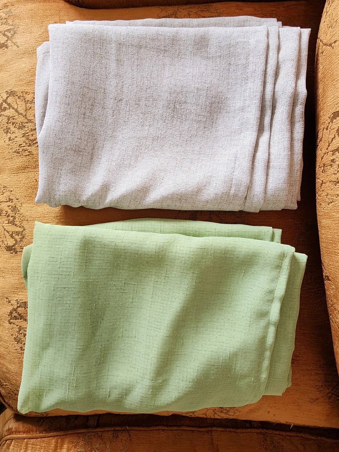 Pick up a set of curtains in cream/beige and green! They're in great condition and would add a nice touch to any room.